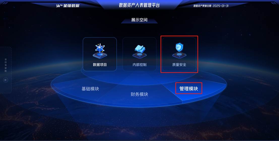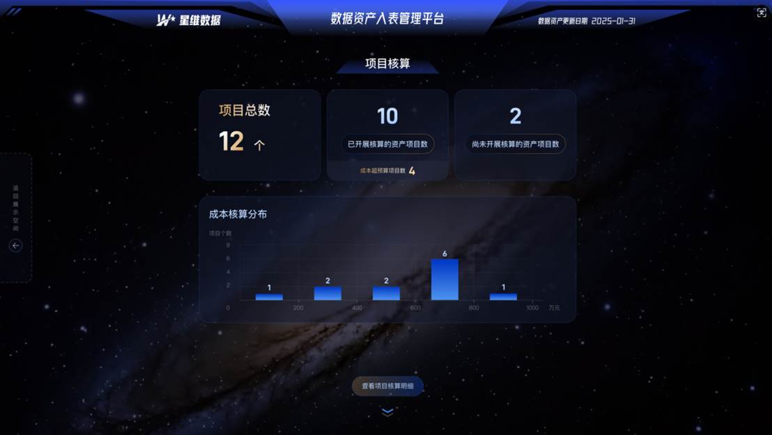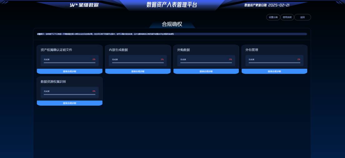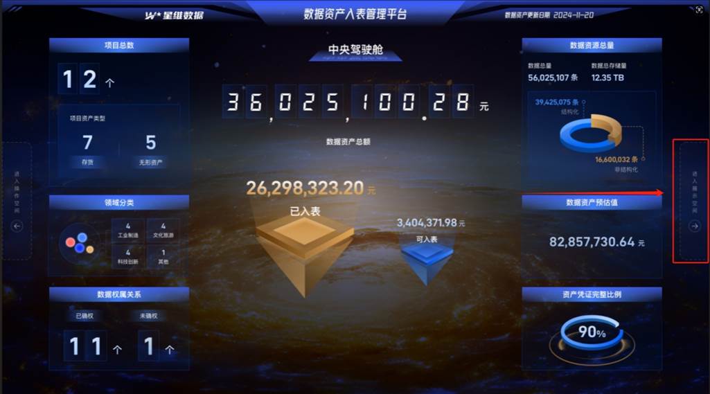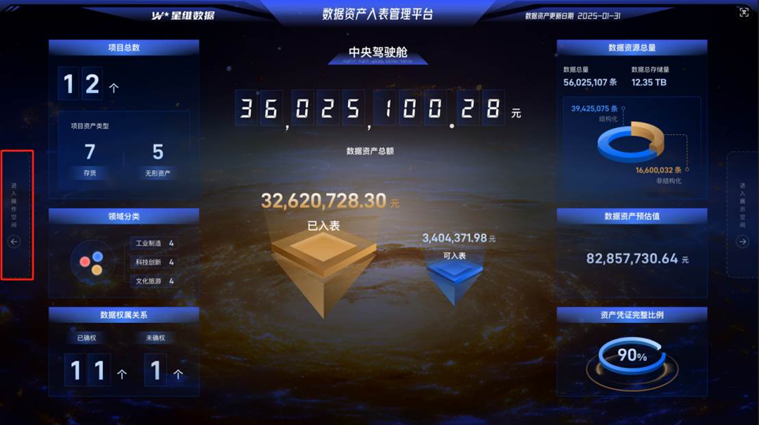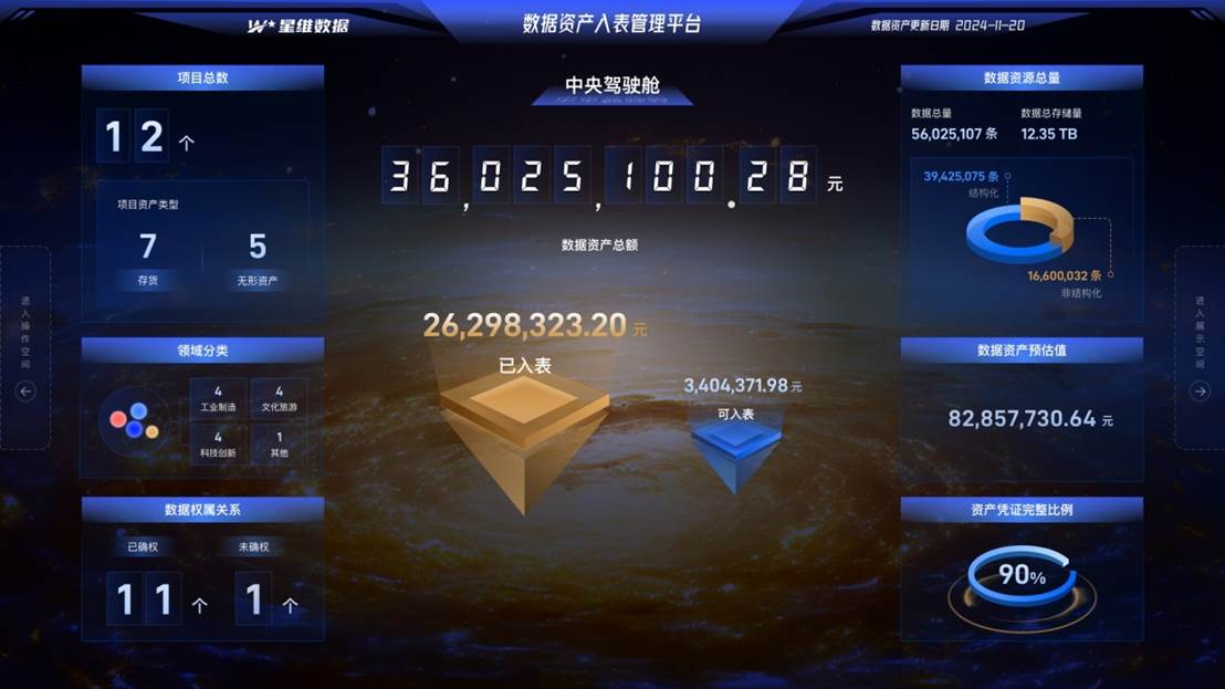 中央驾驶舱是用户的登录入口。本页面展示了数据资产入表各维度的核心指标,均通过系统根据各模块记录的数据汇总计算而得。以下将进一步说明这些核心指标的具体含义。
