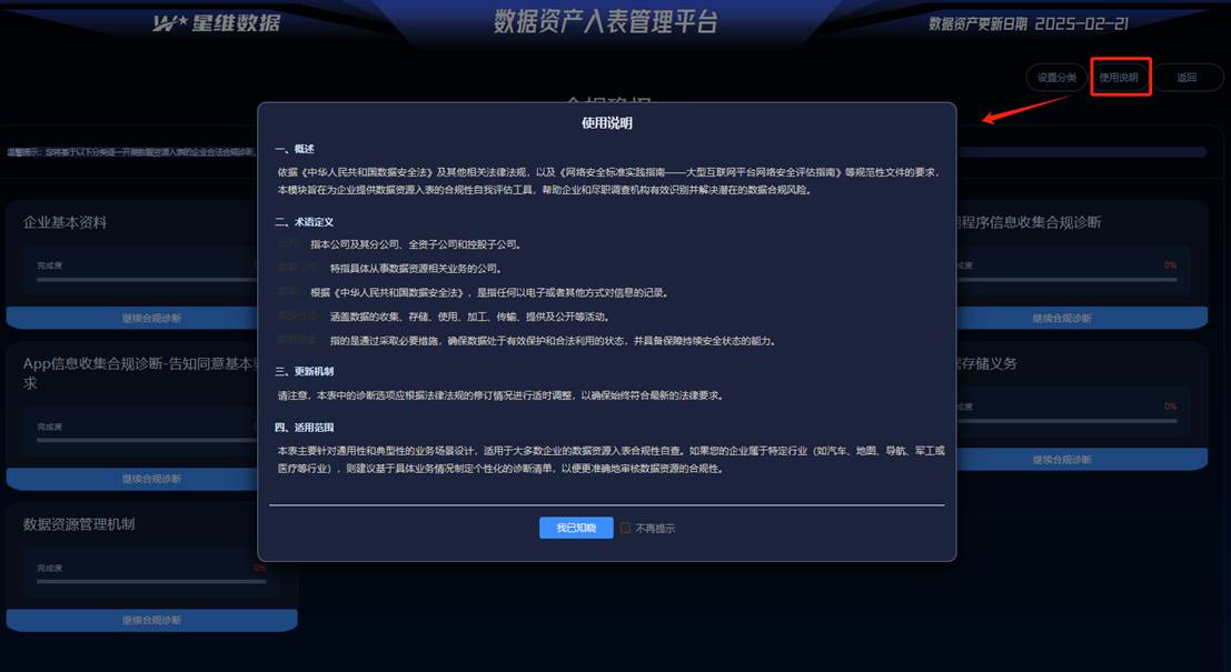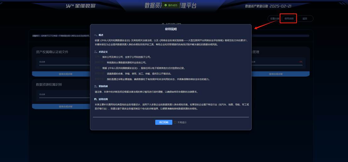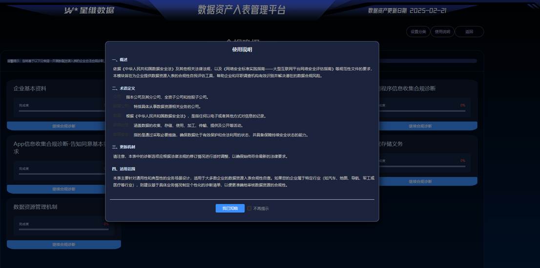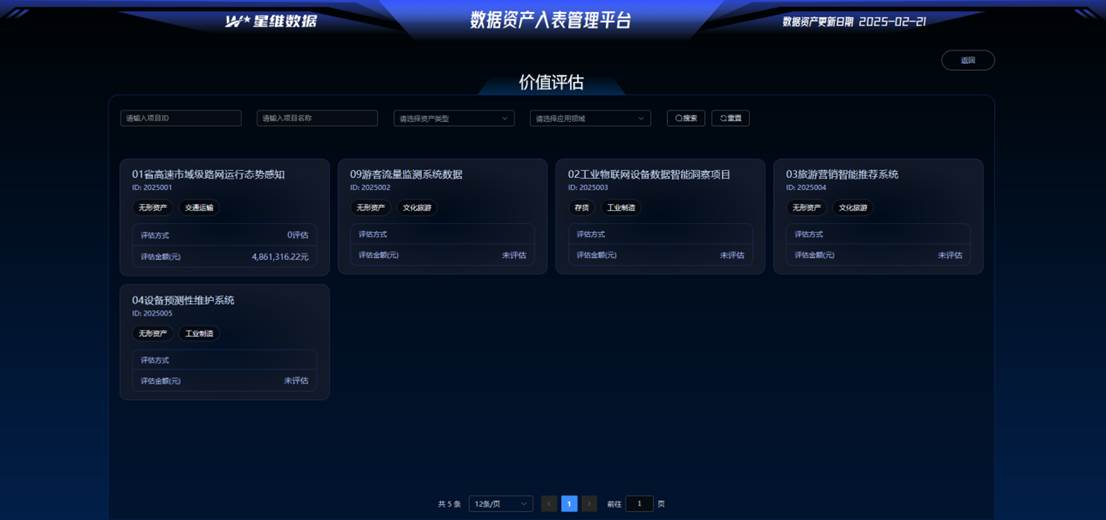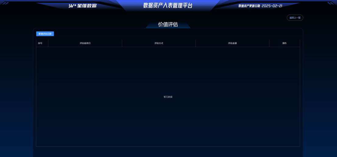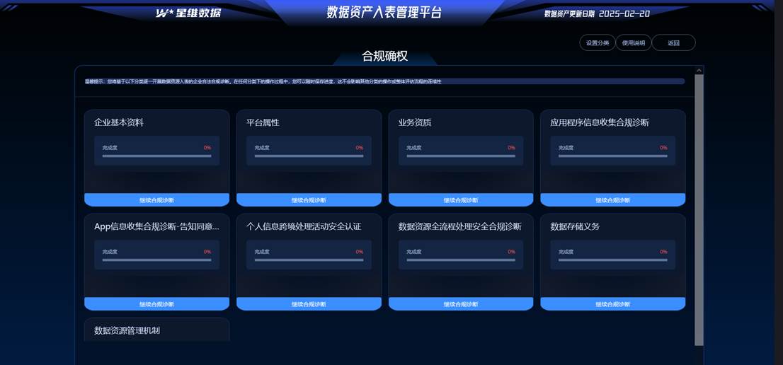 中央驾驶舱是用户的登录入口。本页面展示了数据资产入表各维度的核心指标,均通过系统根据各模块记录的数据汇总计算而得。以下将进一步说明这些核心指标的具体含义。
