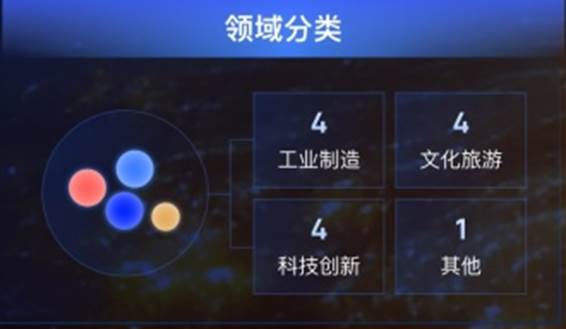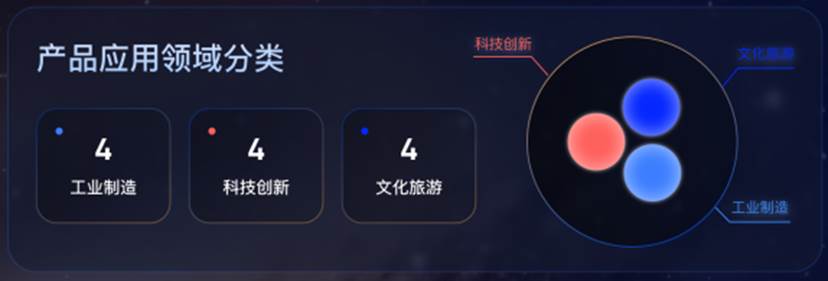 数据项目的产品应用领域分类。如上图举例所示:12个项目中,其中工业制造项目为4个;科技创新项目数量为4个;文化旅游项目为4个。