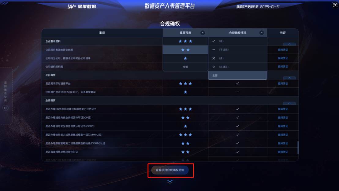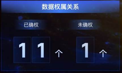 “数据权属关系”展示了各项目是否完成权属确认的情况。其中“已确权”数量=“已经完成”权属确认的项目数量;“未确权”数量= “未完成”权属确认的项目数量。项目总数=已确权(项目数)+未确权(项目数)。