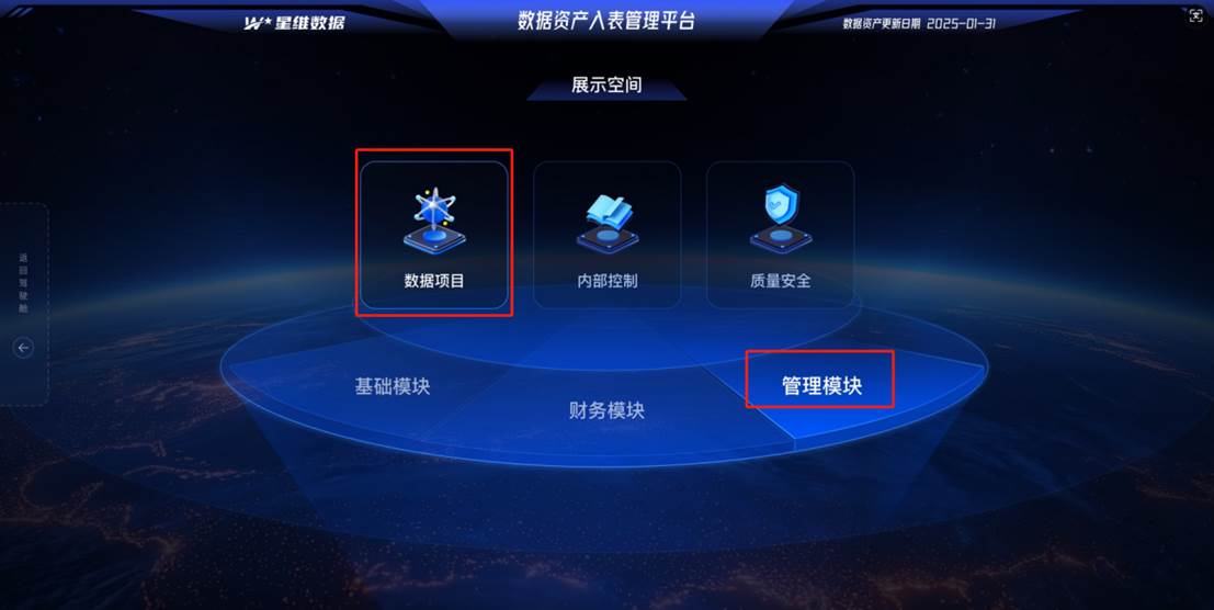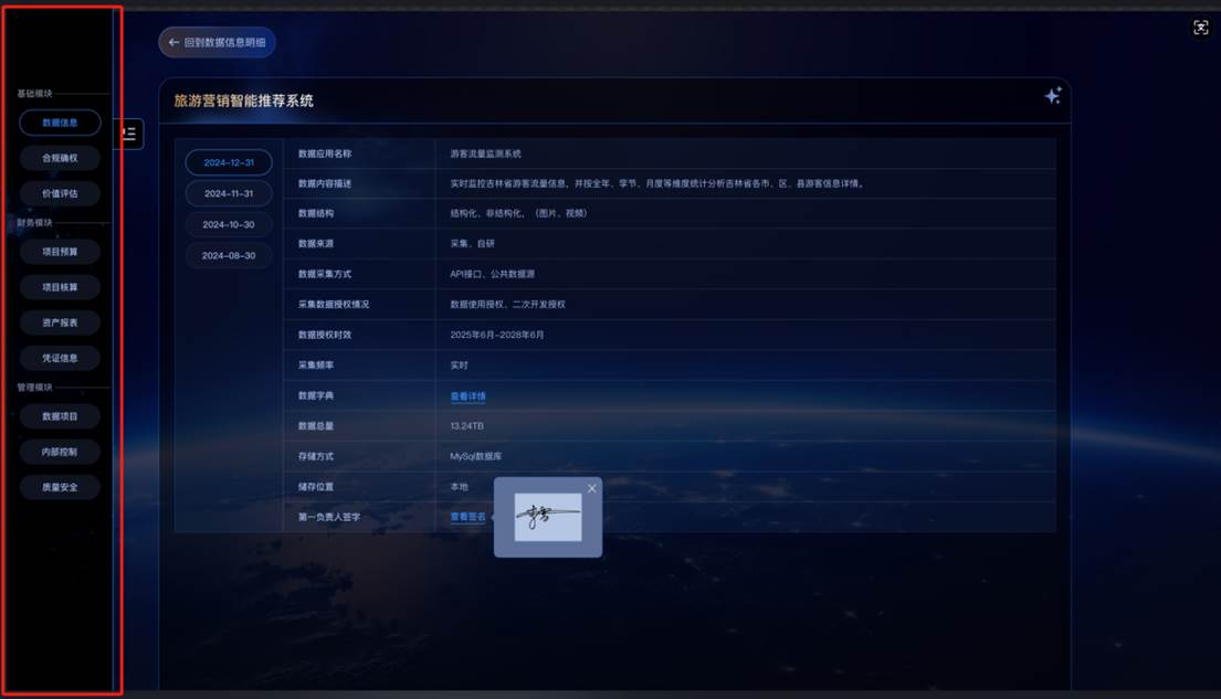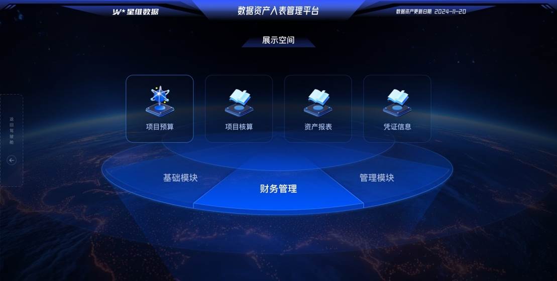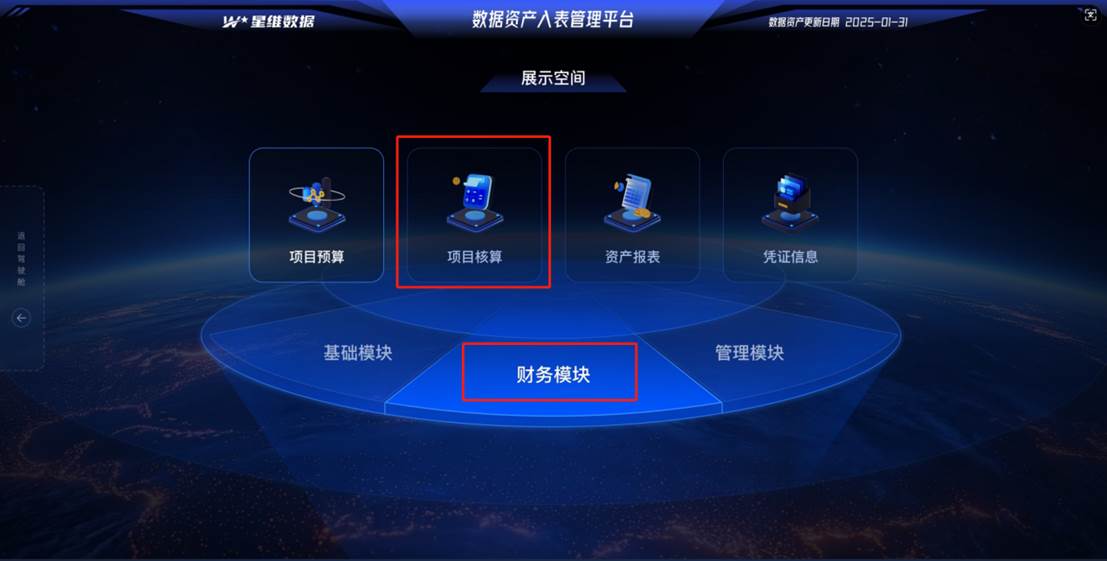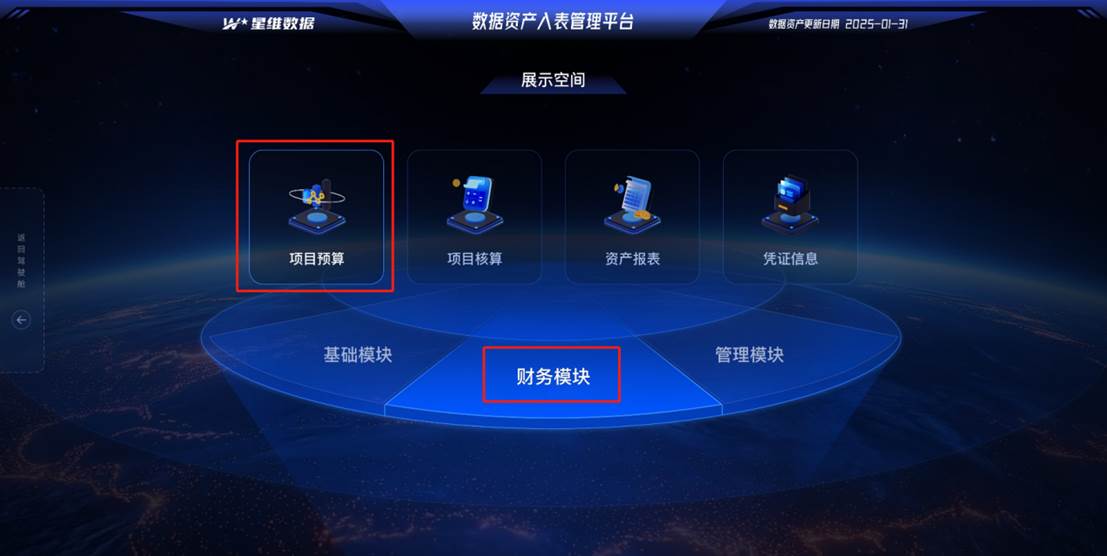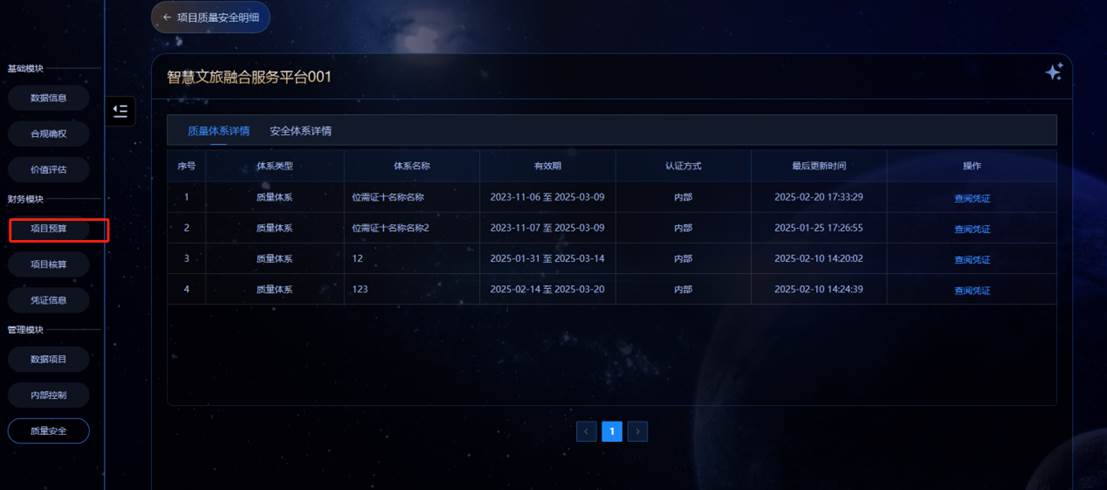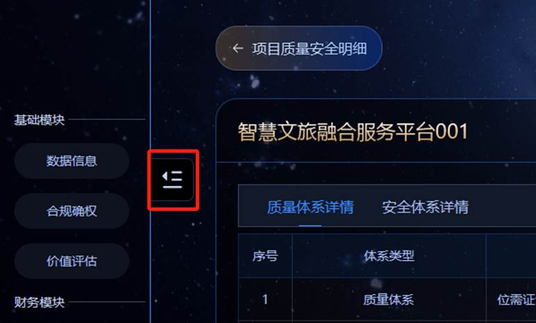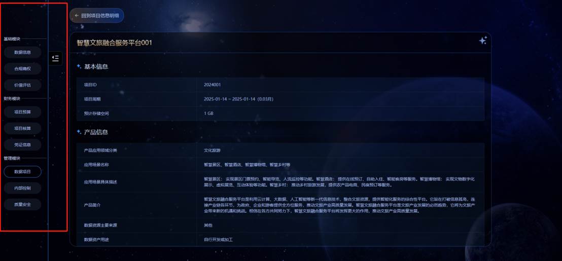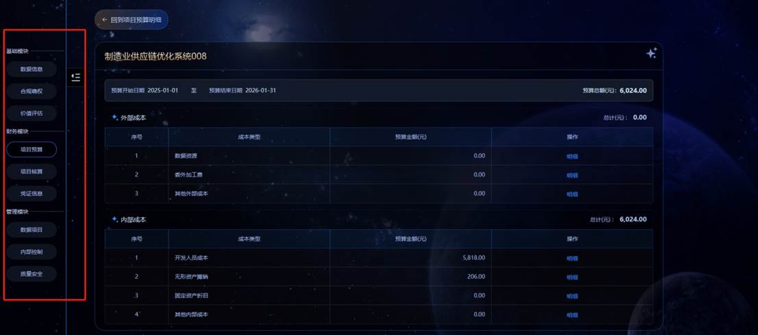 展示空间项目内导航栏(以下简称“导航栏”)出现在展示空间中单个项目详情页中,包括基础模块中的:数据信息、合规确权、价值评估;财务模块中的:项目预算(上图举例)、项目核算、凭证管理;管理模块中的:数据项目(上图举例)、内部控制、质量安全(上图举例)。