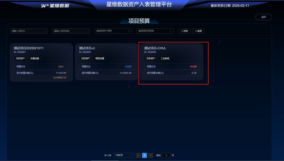 进入项目预算页面,可以查看到所有项目的清单,每个项目以卡片形式展示。