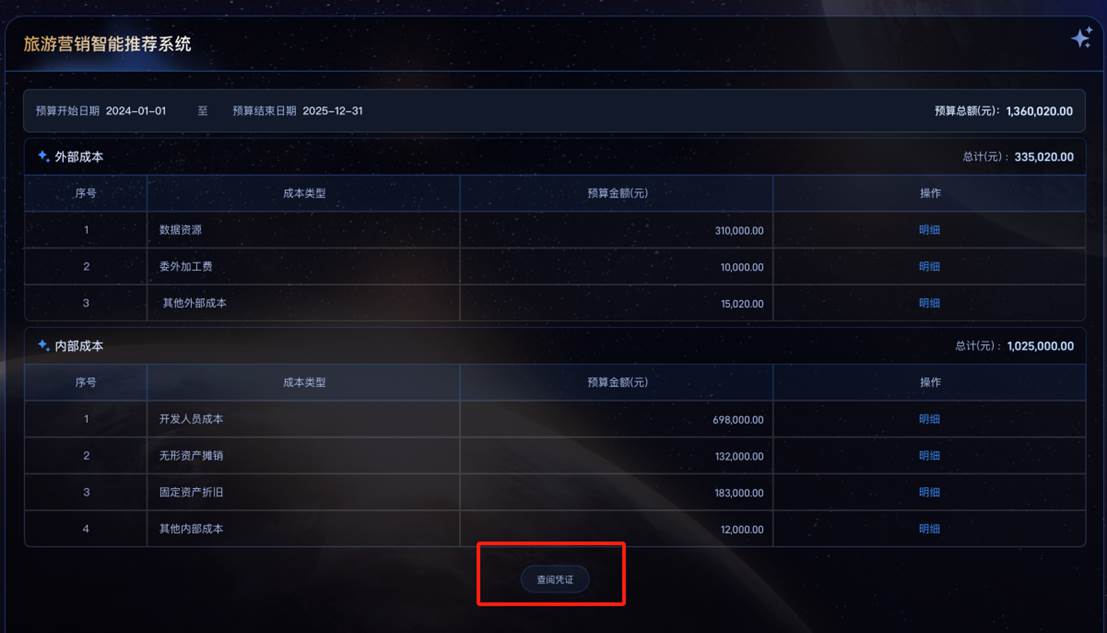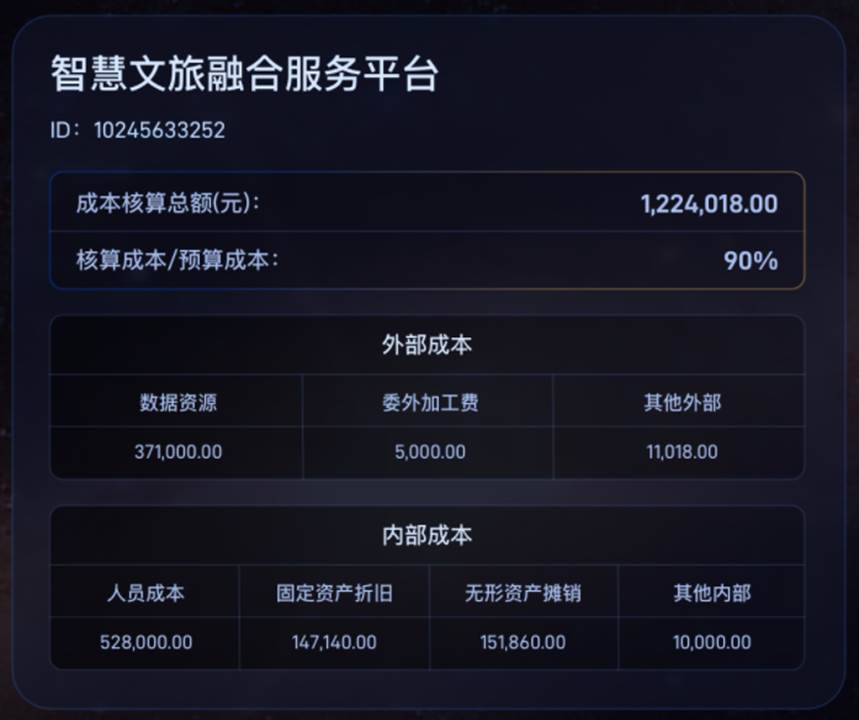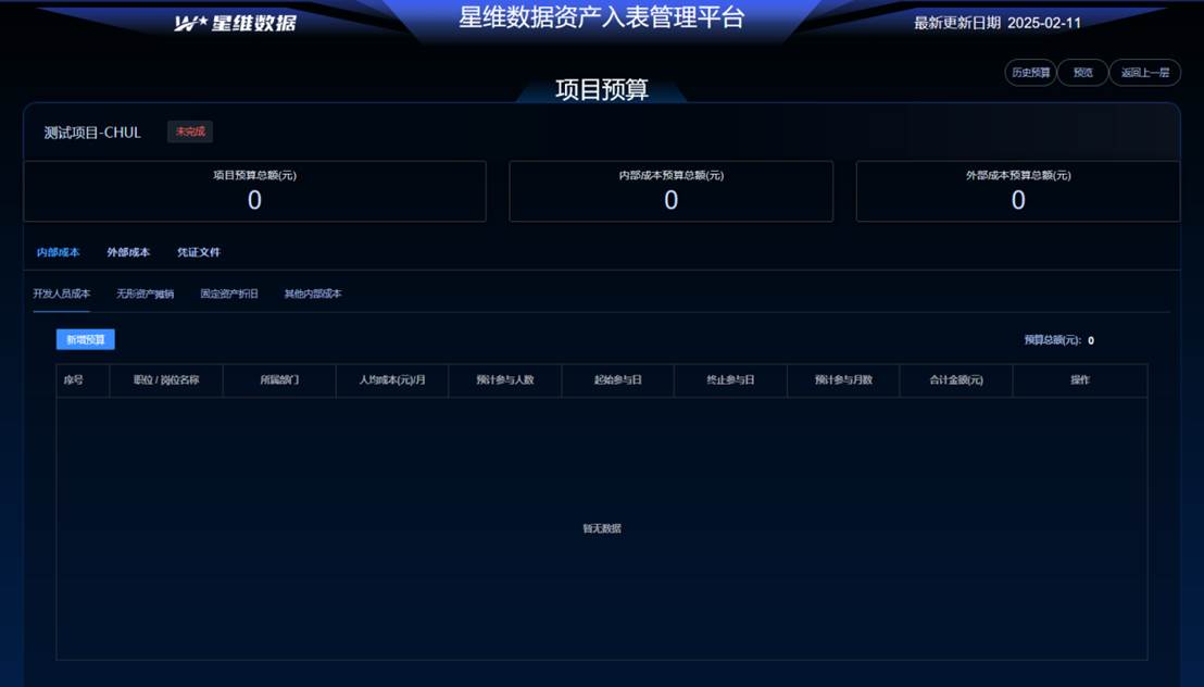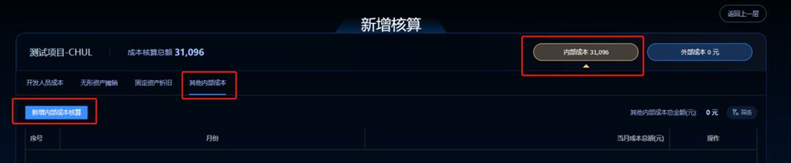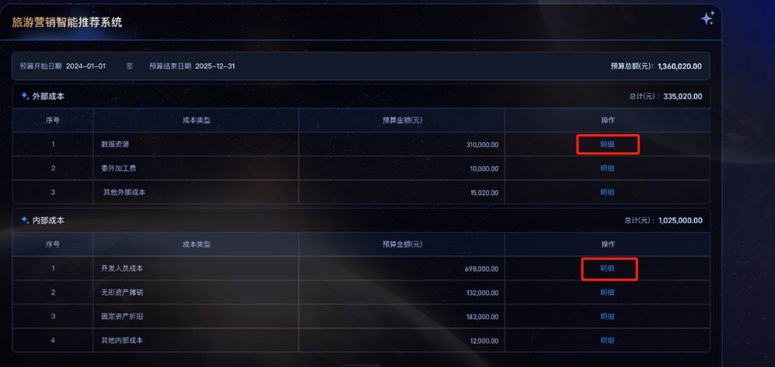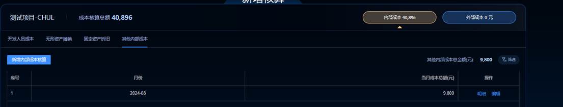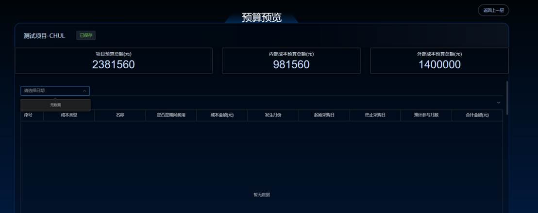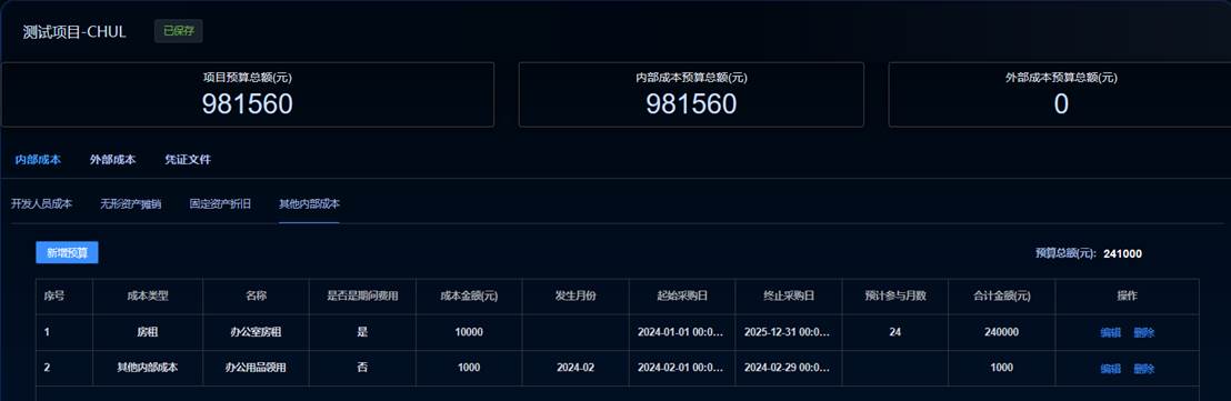 递交后返回“项目预算”页面,显示了本次其他内部成本预算填报后的结果。