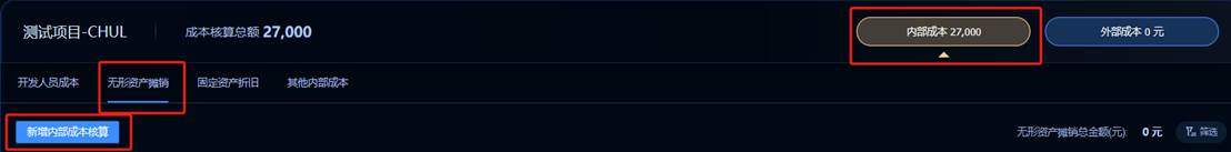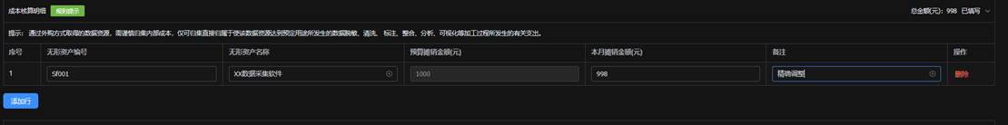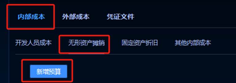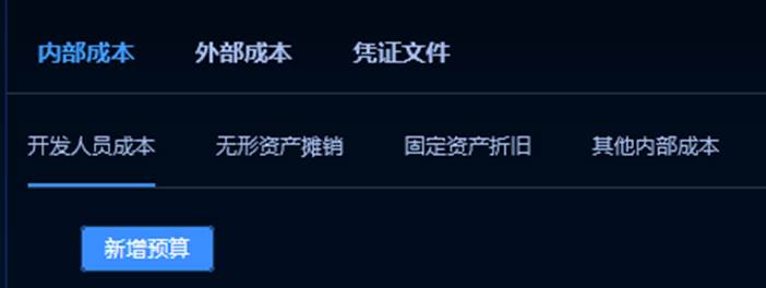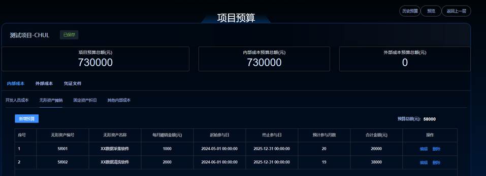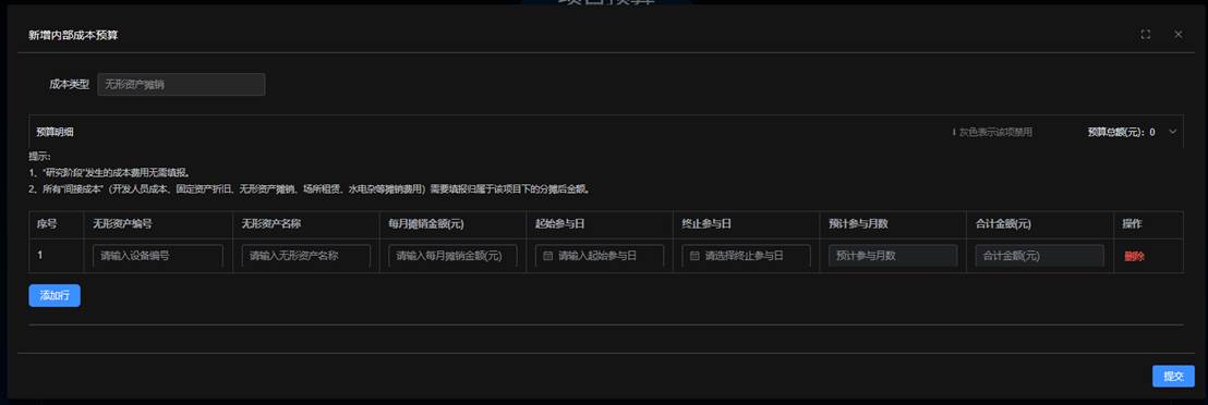 依次点击“内部成本”按钮、“无形资产摊销”按钮、“新增预算”按钮后,进入“新增内部成本预算-无形资产摊销”页面。