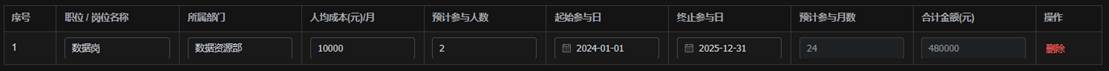 用户依次填报职位/岗位名称、所属部门、人均成本(元)/月、预计参与人数、起始参与日、终止参与日。系统将自动计算预计参与月数、合计金额(元)。