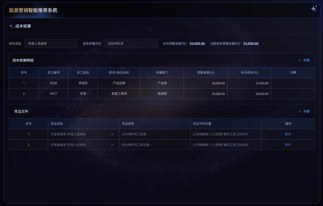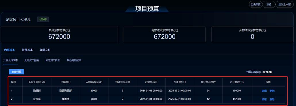 递交后返回“项目预算”页面,显示了本次开发人员成本预算填报后的结果。