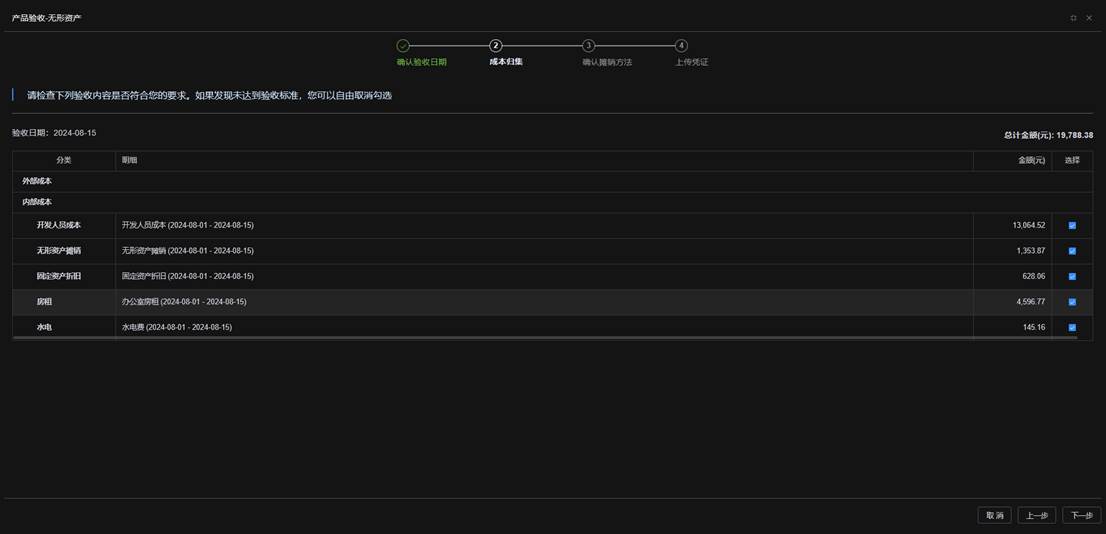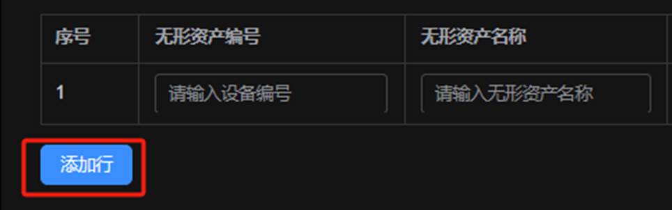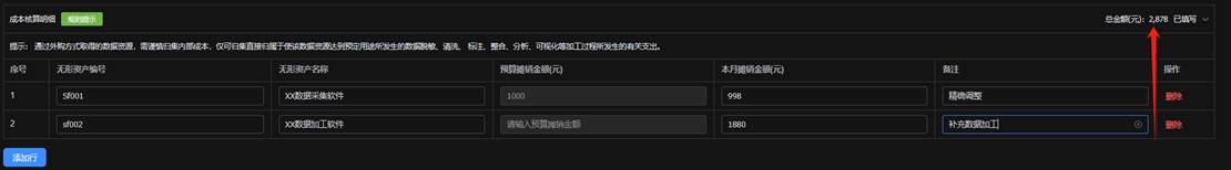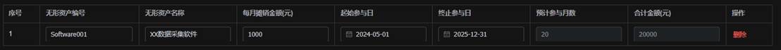 用户依次填报无形资产编号、无形资产名称、每月摊销金额(元)、起始参与日、终止参与日。系统将自动计算预计参与月数、合计金额(元)。