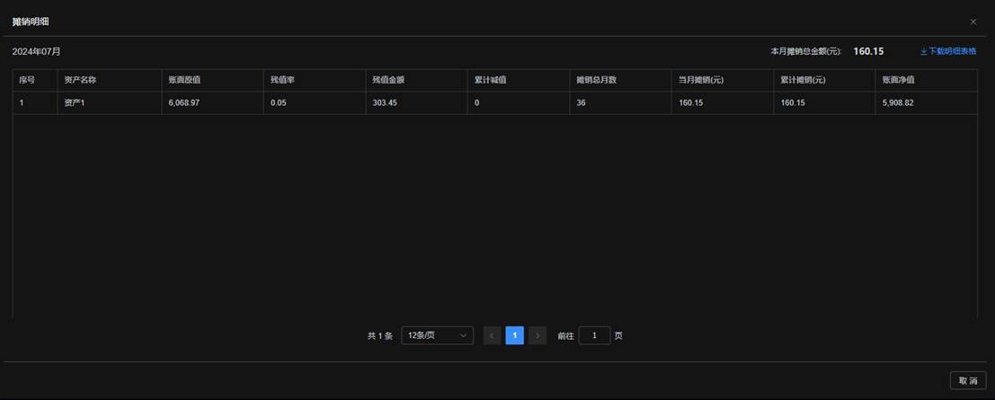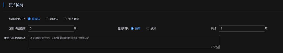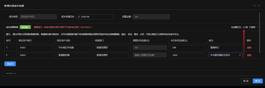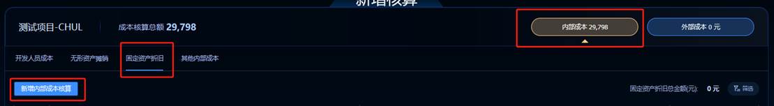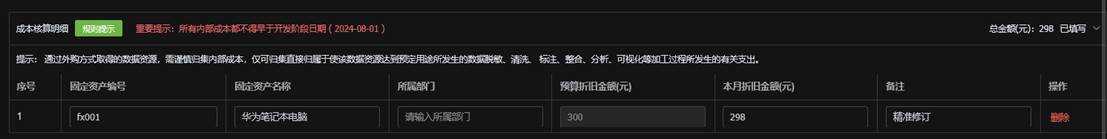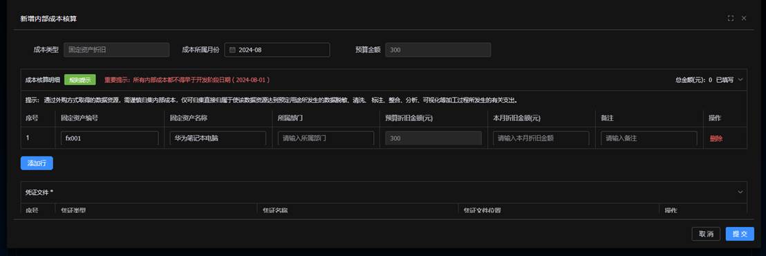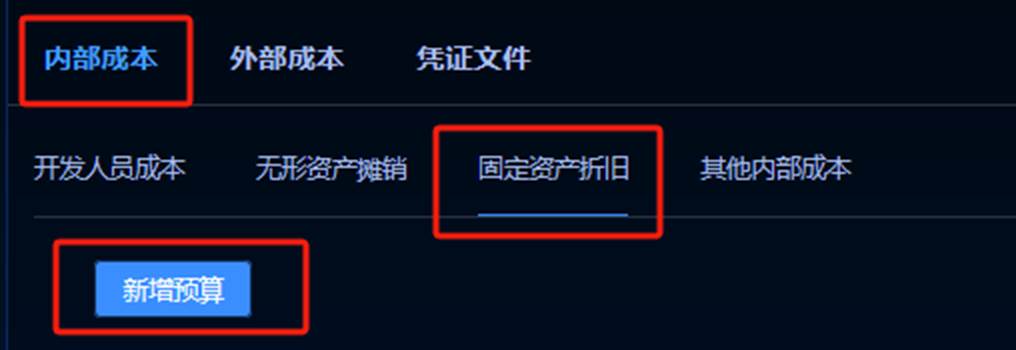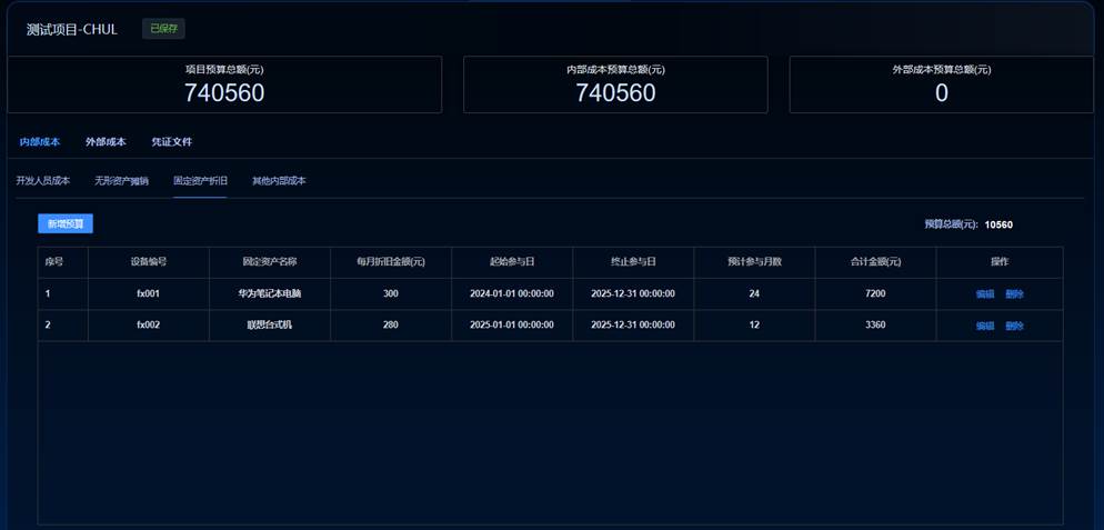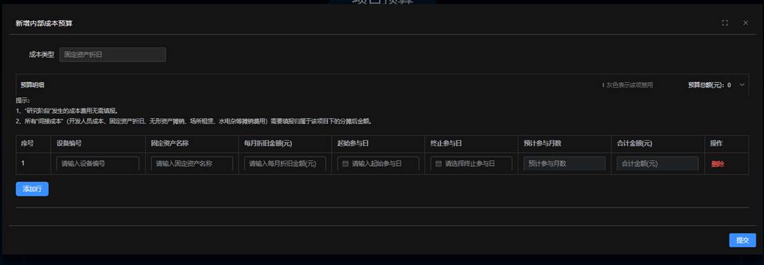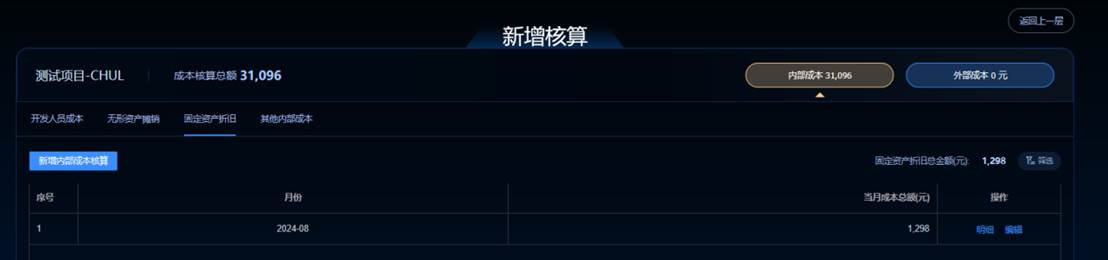依次点击“内部成本”按钮、“固定资产折旧”按钮、“新增预算”按钮后,进入“新增内部成本预算-固定资产折旧”页面。