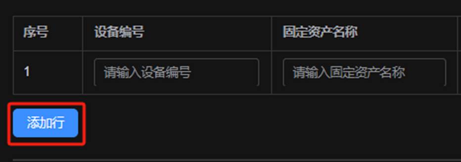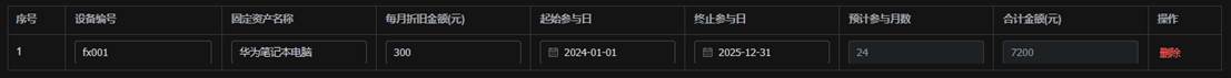 用户依次填报设备编号、固定资产名称、每月折旧金额(元)、起始参与日、终止参与日,系统自动计算预计参与月数、合计金额(元)。