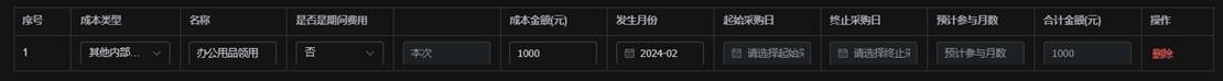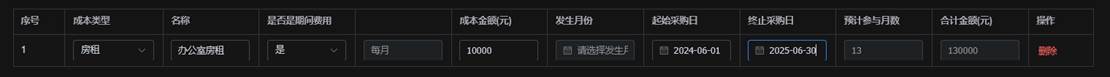 (1)如果选择期间成本。以房租为例,需要填报预计“每月”的“成本金额”,然后填报“起始采购日”、“终止采购日”,系统将自动计算出“参与月数”和“合计金额”。