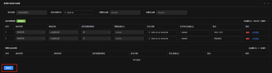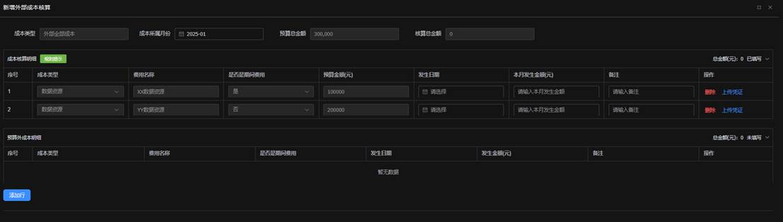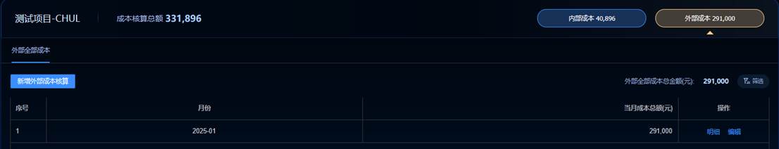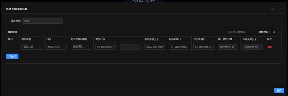 依次点击“外部成本”按钮和“新增预算”按钮后,进入“新增外部成本预算”页面。