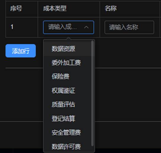 在“成本类型”下拉框中,可以选择外部成本的类型,比如“数据资源”、“委外加工费”、“保险费”、“权属鉴证”、“质量评估”、“登记结算”、“安全管理费”、“数据许可费”。