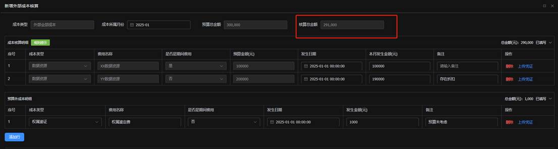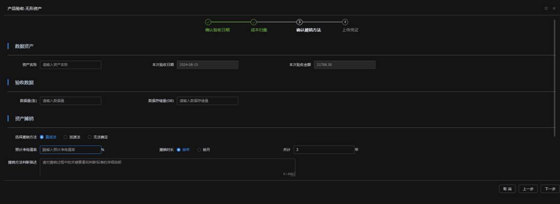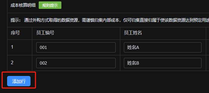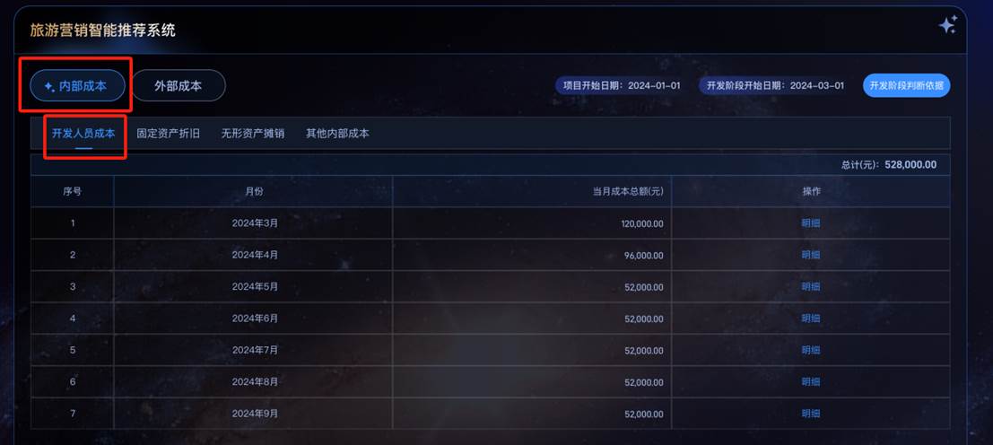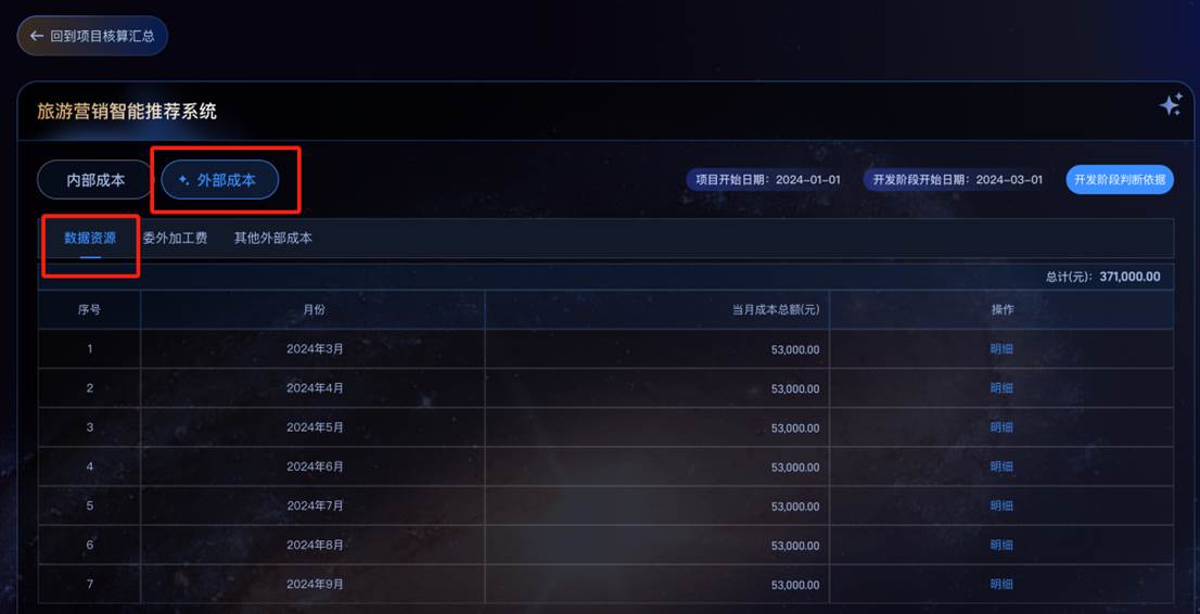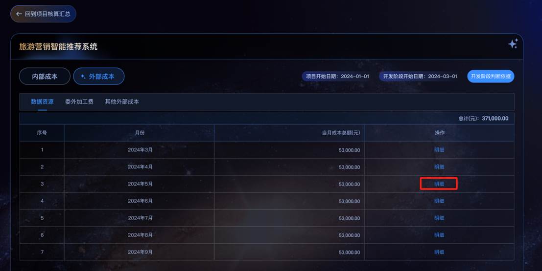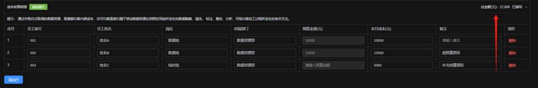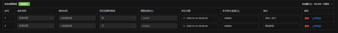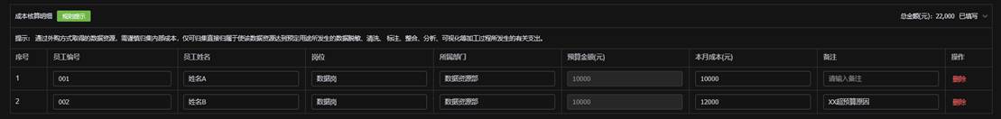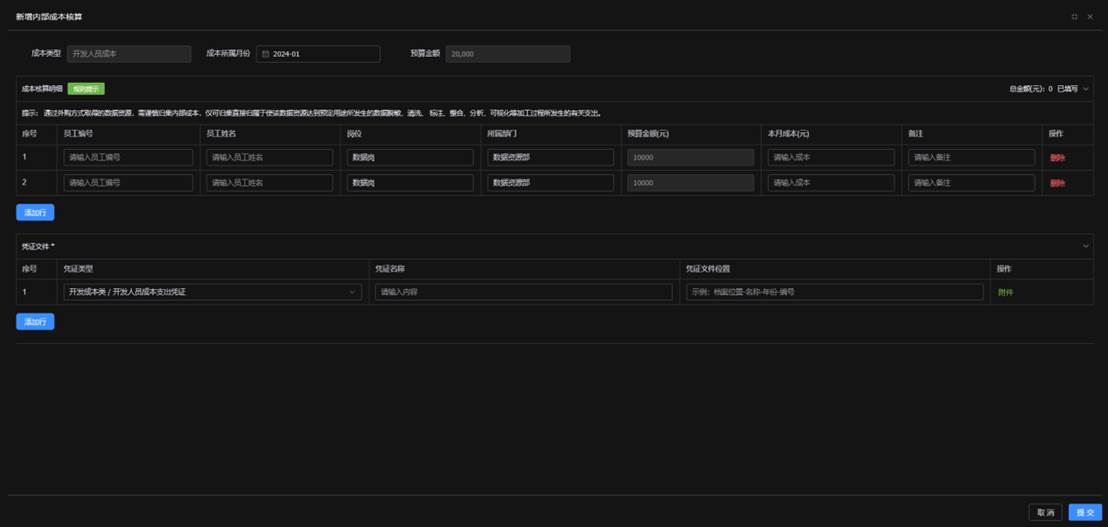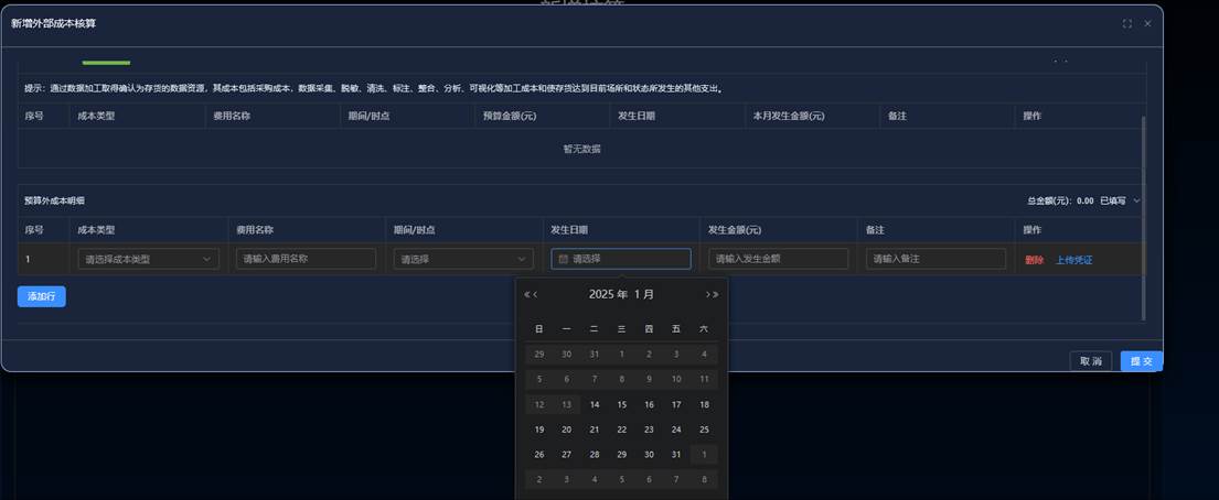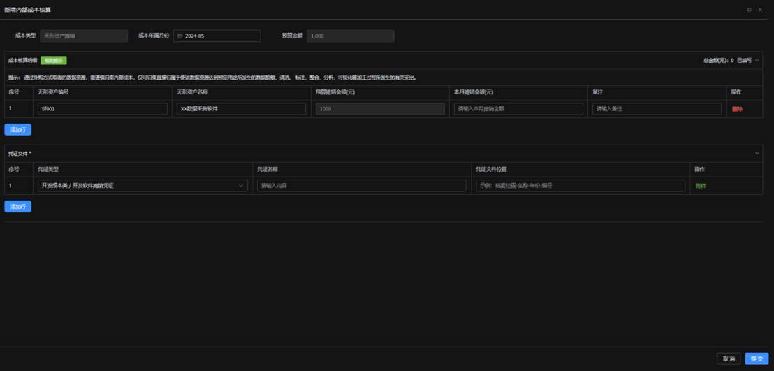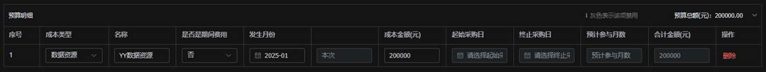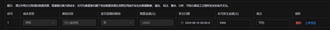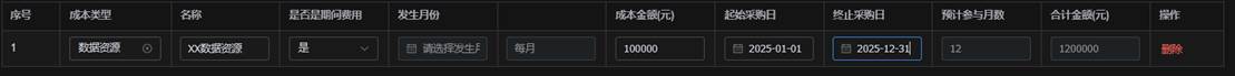 (1)如果选择期间成本,以持续采购数据资源为例,需要填报预计“每月”的“成本金额”,然后填报“起始采购日”、“终止采购日”,系统将自动计算出“参与月数”和“合计金额”。