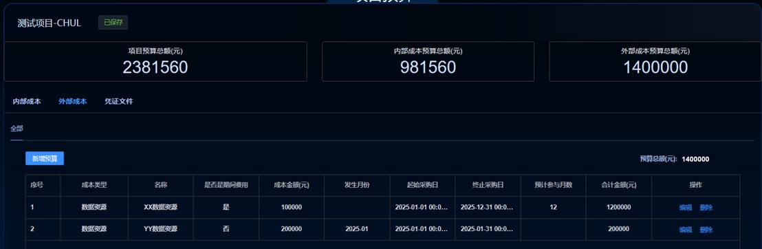 递交后返回“项目预算”页面,显示了本次外部成本预算填报后的结果。