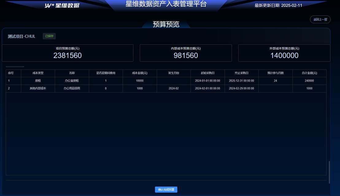 确认无误后,点击“确认完成预算”按钮,完成预算的填报。