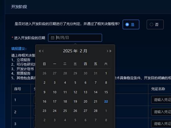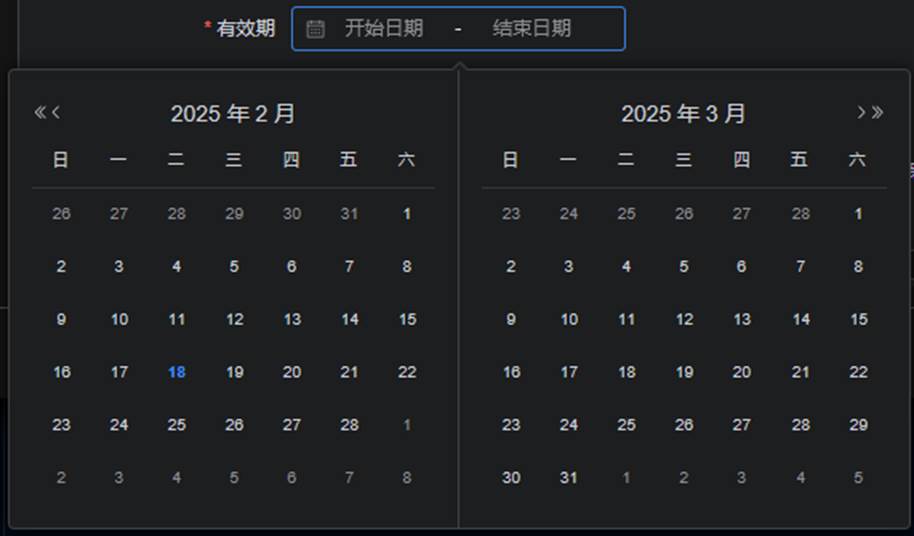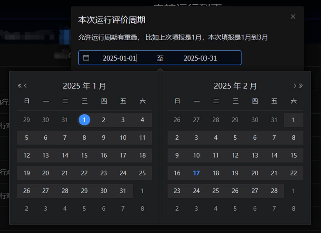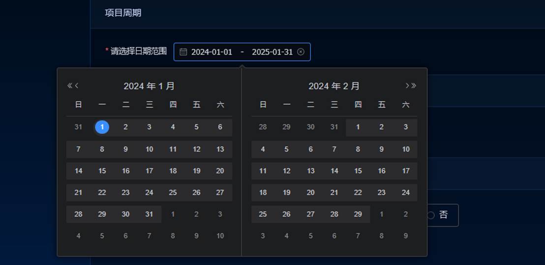 选择项目周期的日期范围,包括起始日期和结束日期。