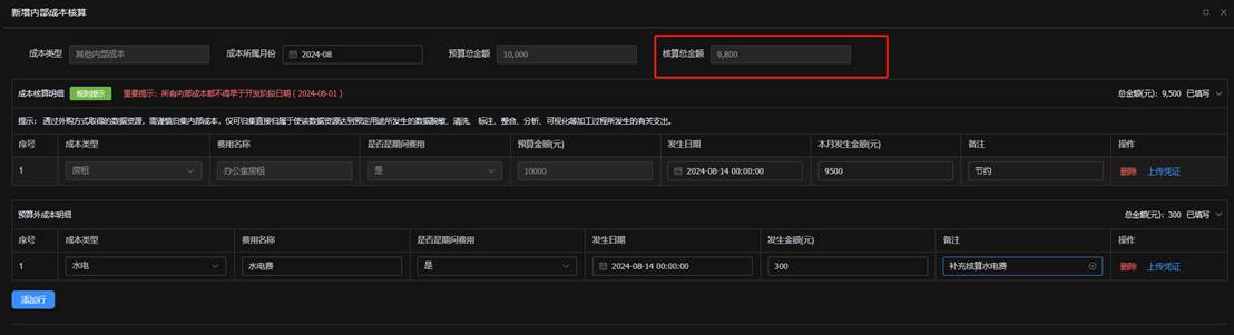 (2)如果选择时点成本。以办公用品领取为例,需要填报“本次”发生的“成本金额”以及预计“发生月份”。