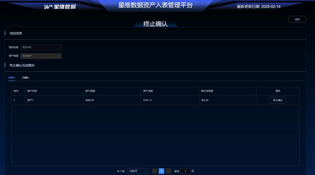 财务模块包括项目预算、开发确认、成本核算、收入核算、产品验收、后续计量、终止确认、资产报表模块。