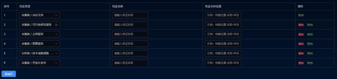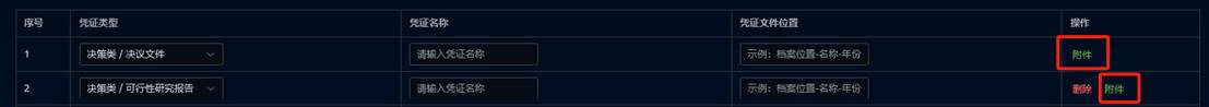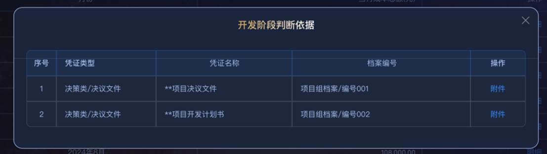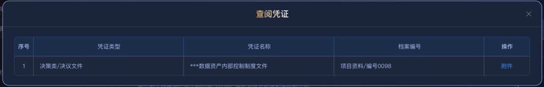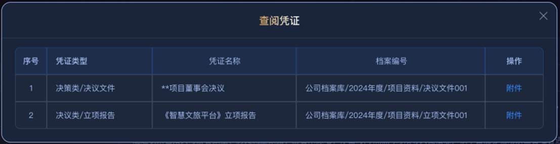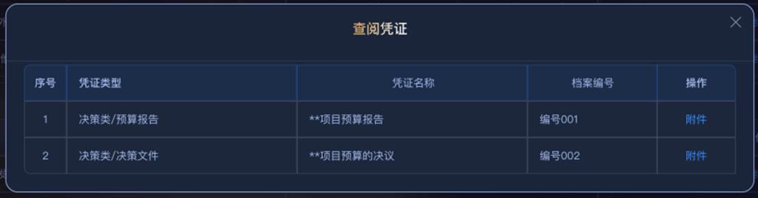 “查阅凭证”窗口中将展示项目相关凭证(如立项报告、相关决策文件)。如存在附件,可以点击“附件”按钮查阅电子凭证。