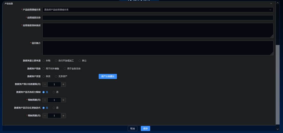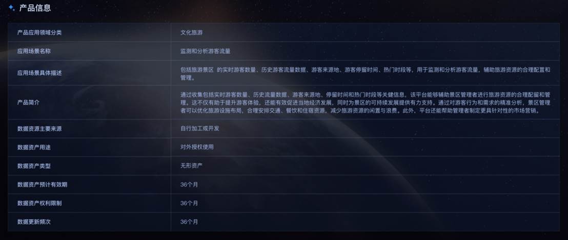 产品信息中展示了产品应用领域分类、应用场景名称、应用场景具体描述、产品简介、数据资源主要来源、数据资产用途、数据资产类型、数据资产预计有效期、数据资产权利限制、数据更新频次。