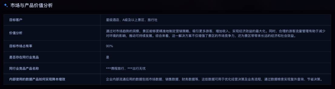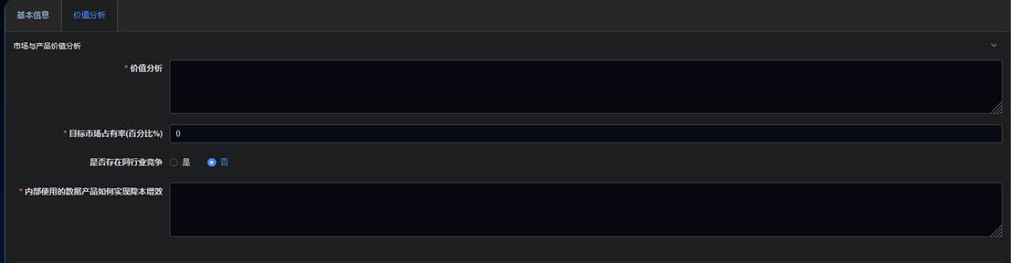 市场与产品价值分析中展示了目标客户、价值分析、目标市场占有率、是否存在同行业竞品、同行业竞品名称、内部使用的数据产品如何实现降本增效。