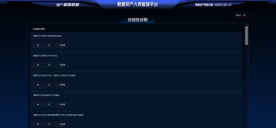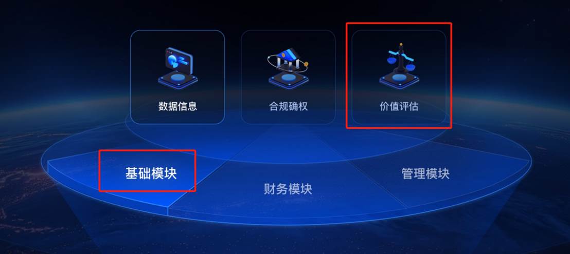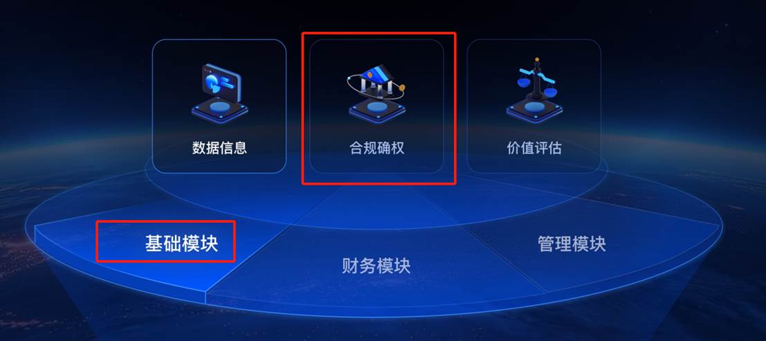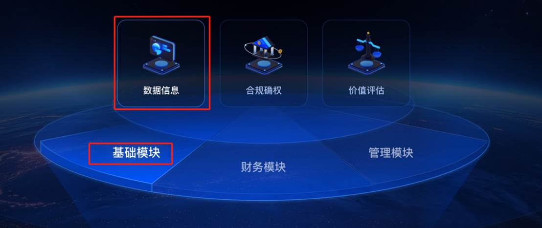 基础模块包括数据信息管理、企业合法合规、项目合规确权、价值评估模块。