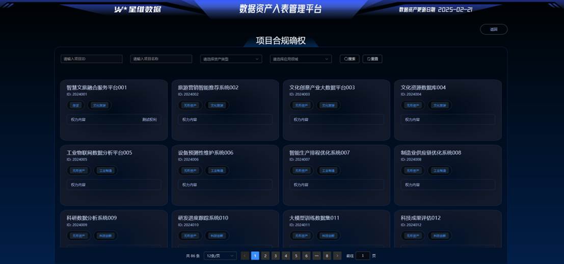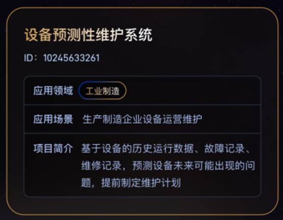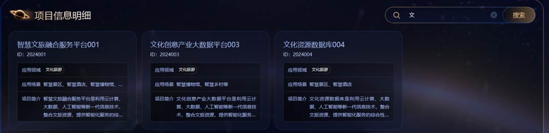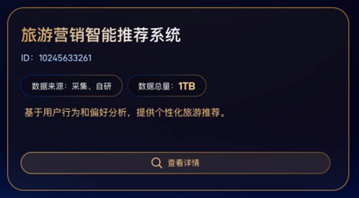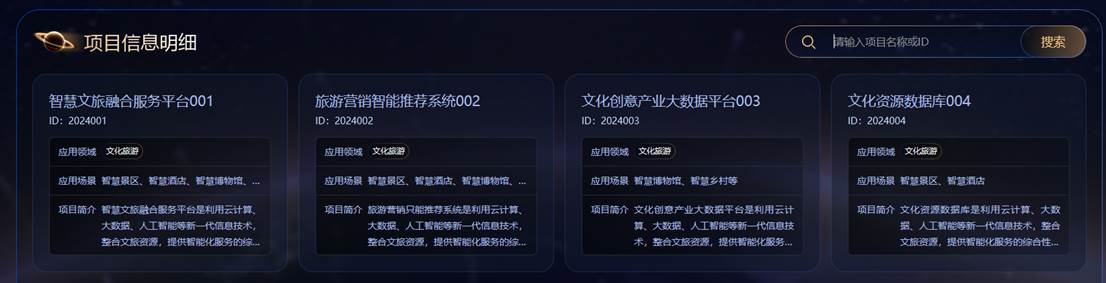 卡片中展示了单个项目信息,包括项目名称、项目ID、应用领域、应用场景、项目简介。点击卡片后,将进入单个数据项目信息详情页面。