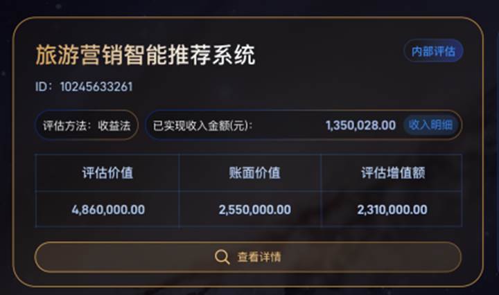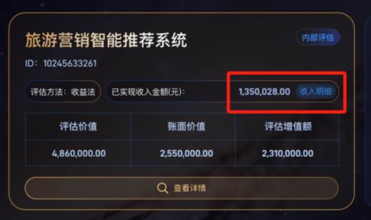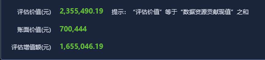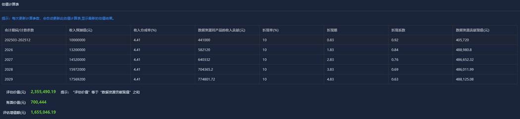 “数据资产预估值”=所有项目数据资产的评估价值总额。每个项目的评估值是按照收益法或市场法评估所得。