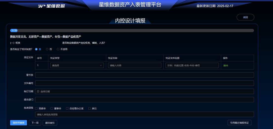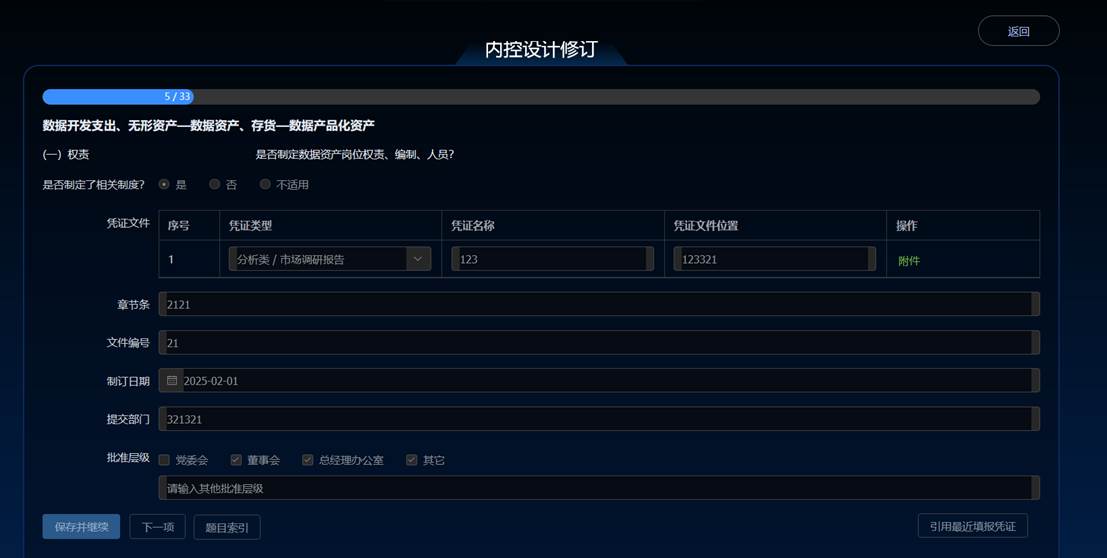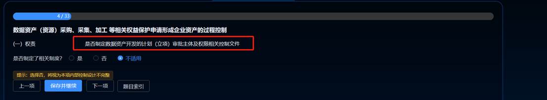 事项明细展示了内部控制每个事项的类型、维度、内容,以及设计完成情况(是、否、不适用、未填写)。