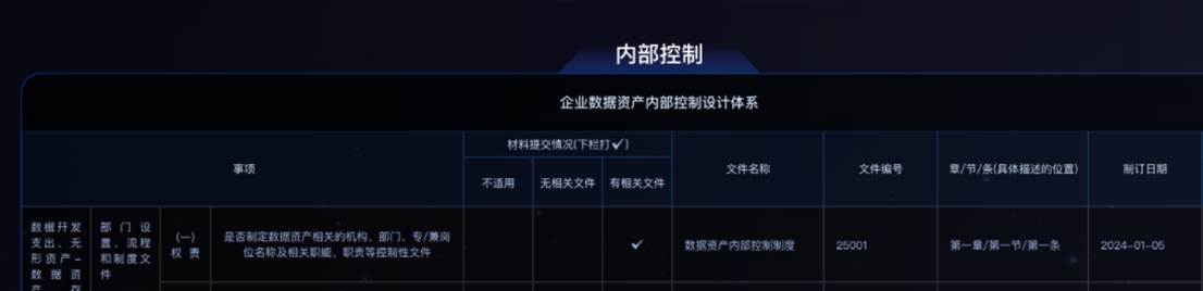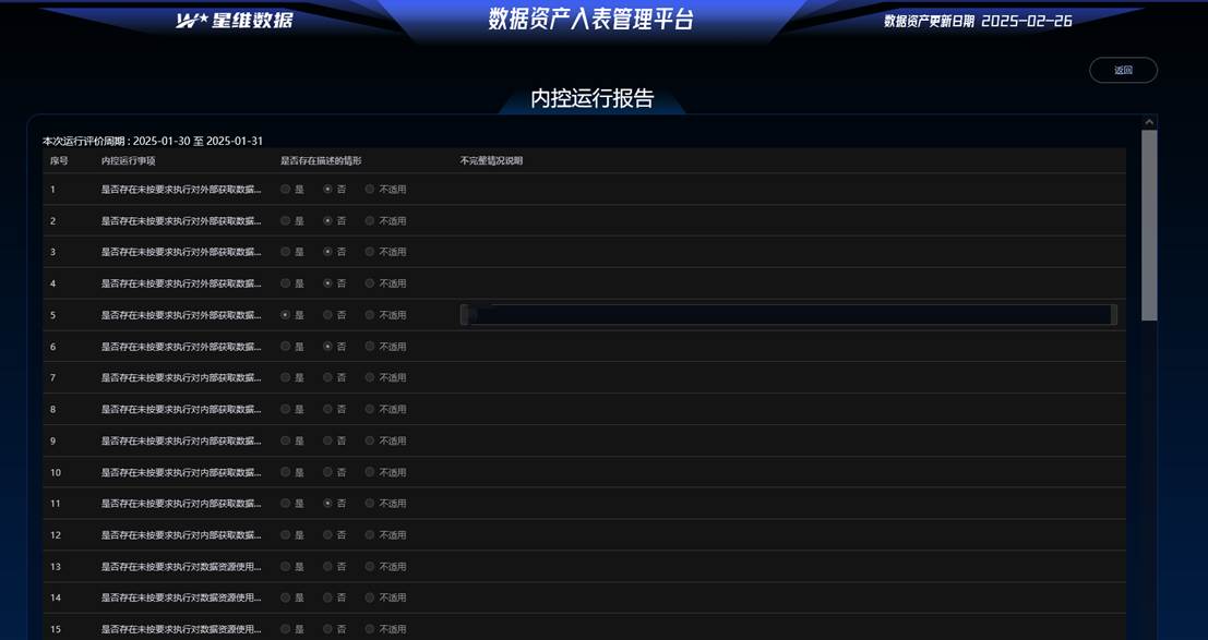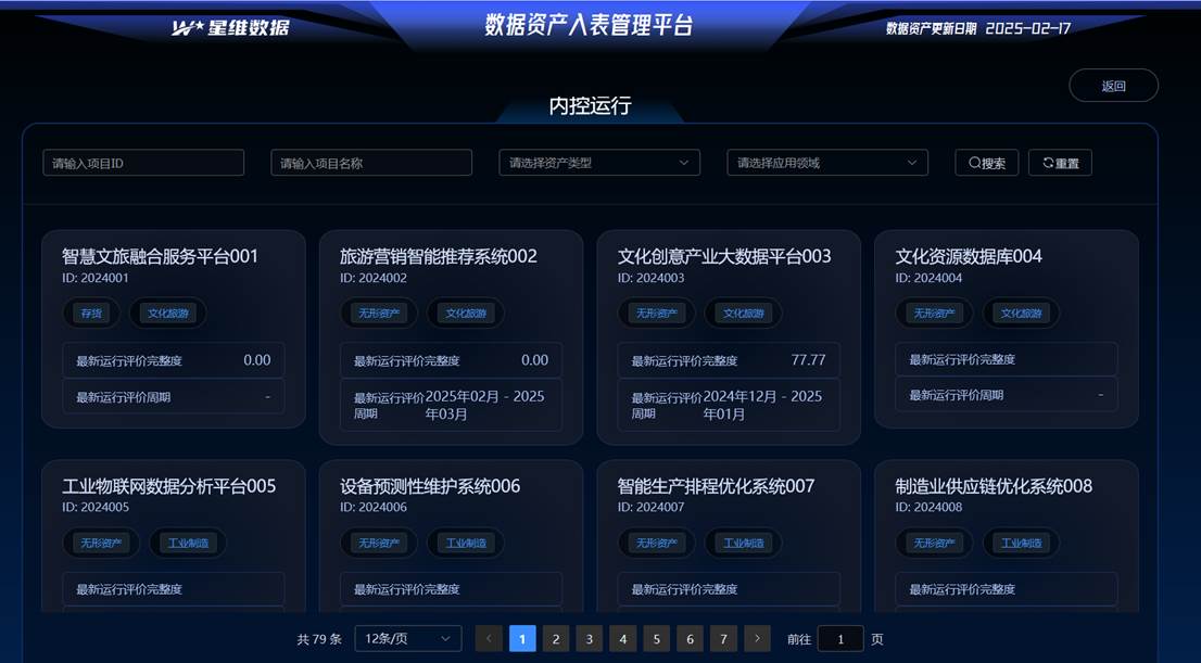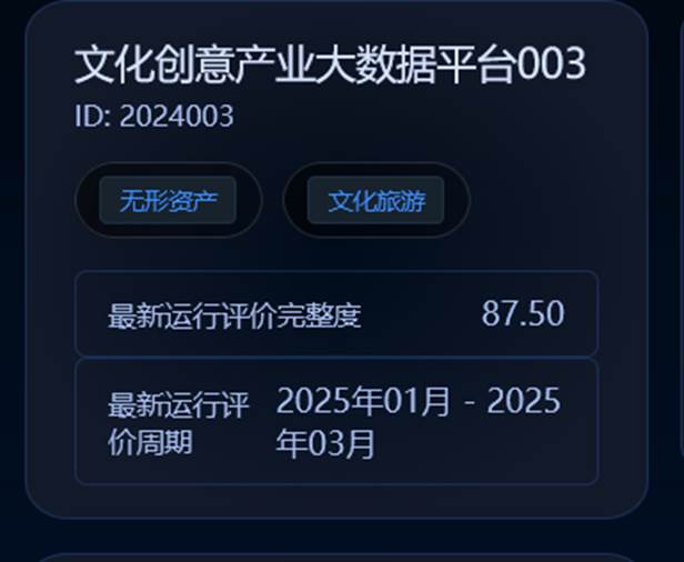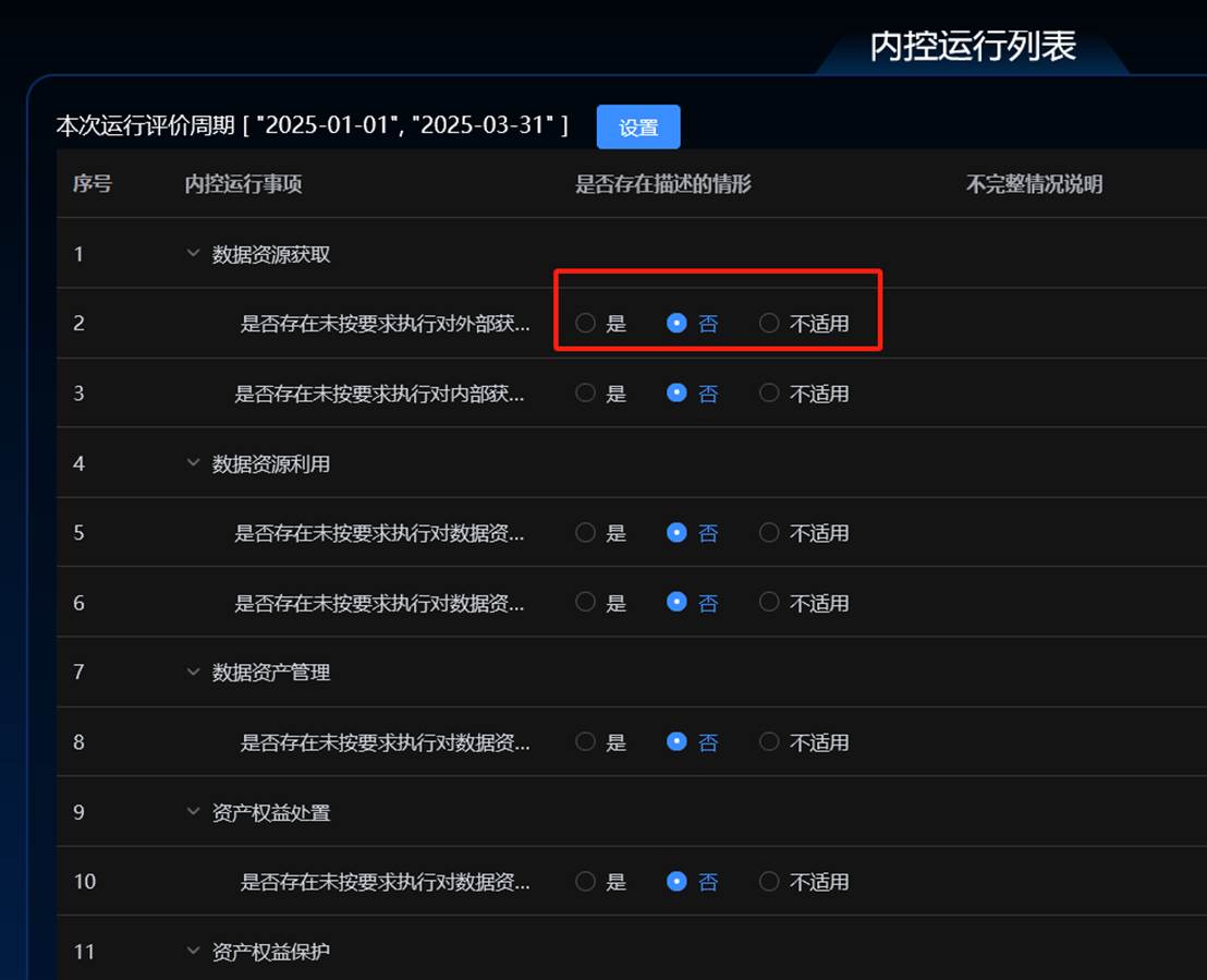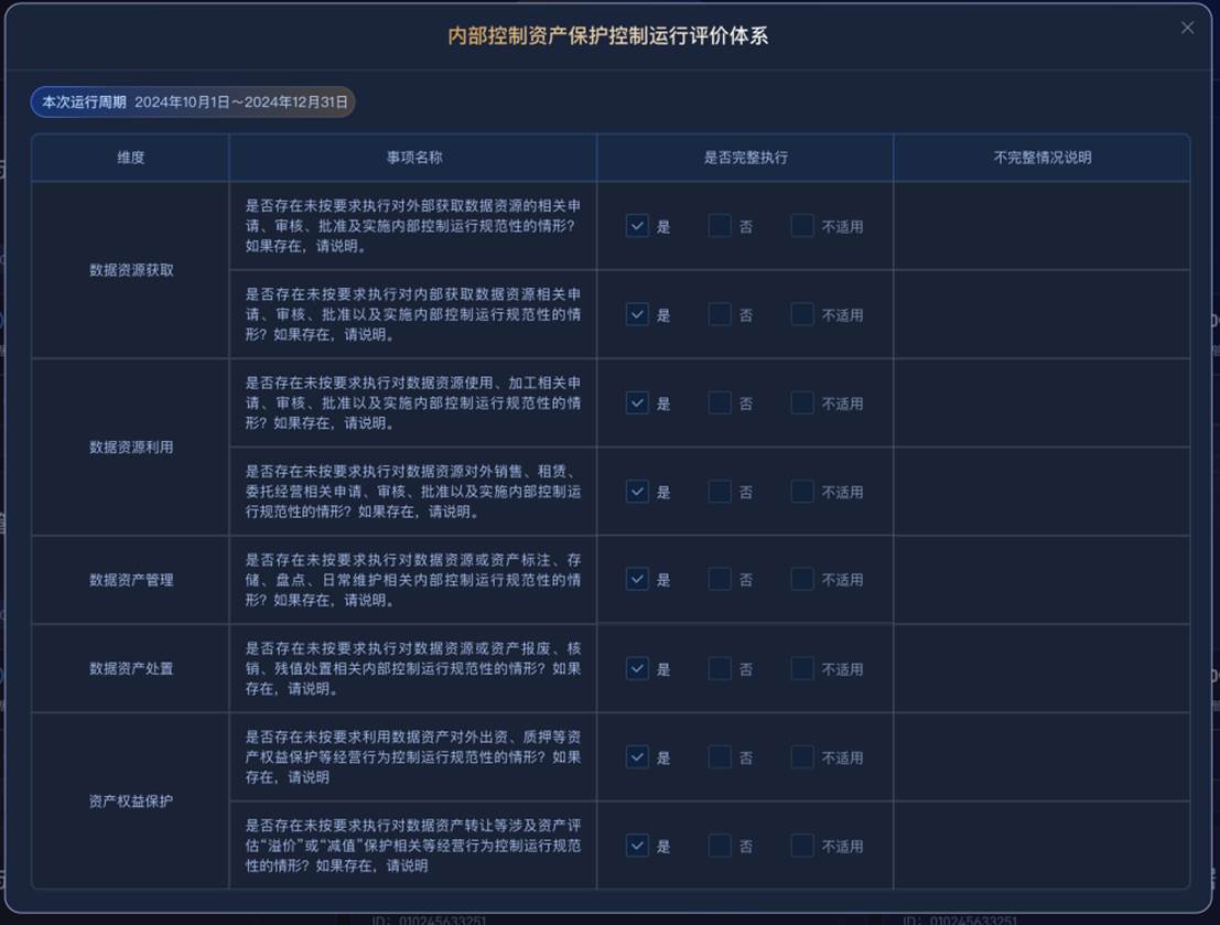 每个项目的内部控制卡片中,展示了该项目名称、项目ID、最新运行评价周期、数据资源获取的内控运行完整度、数据资源利用的内控运行完整度、数据资源管理的内控运行完整度、数据资源处置的内控运行完整度、资产权益保护的内控运行完整度。点击每个卡片后,进入单个项目内控控制运行详情(内部控制资产保护控制运行评价体系)。
