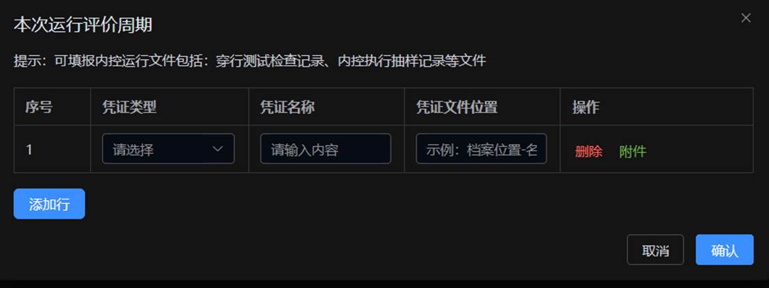 用户可以在列表中查看内控设计的凭证文件。如存在附件,可以点击“附件”按钮查阅电子凭证。(提示:如果内部控制设计操作空间上传多个“重名”文件时,展示空间将展示其中一个完整文件,将不会重复展示多条记录)