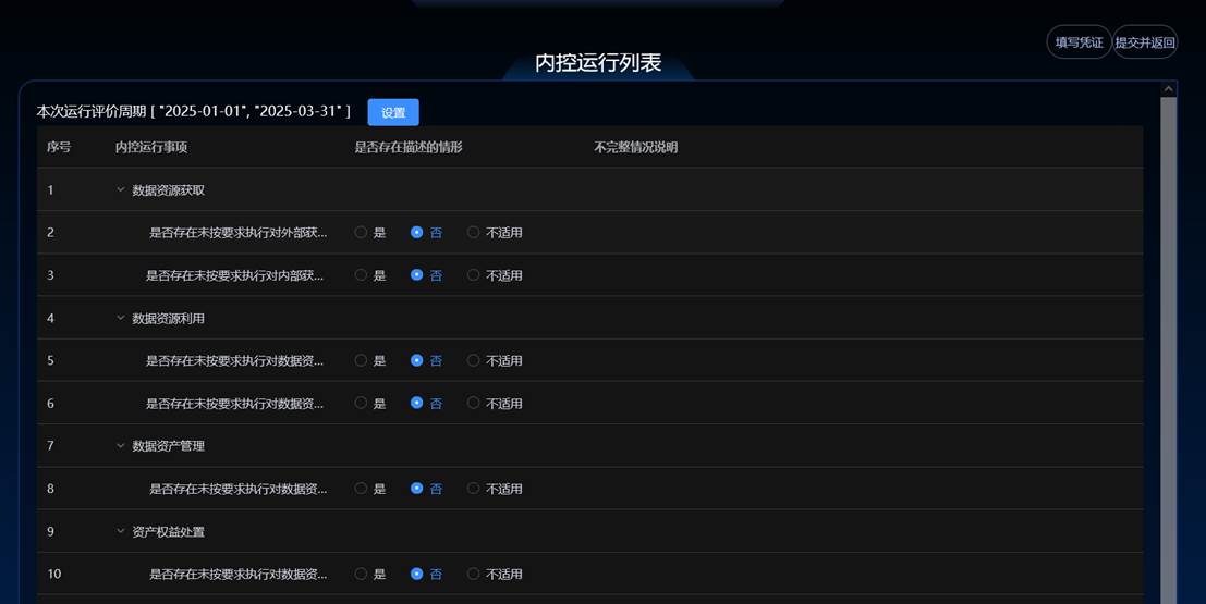 内部控制资产保护控制运行评价体系界面中展示了,本次运行周期、各个维度下的各事项的是否完整执行情况。如运行不完整,展示不完整情况说明。点击查看凭证按钮,可以查看本次内部控制运行的穿行测试或抽样检查凭证 [48] 。