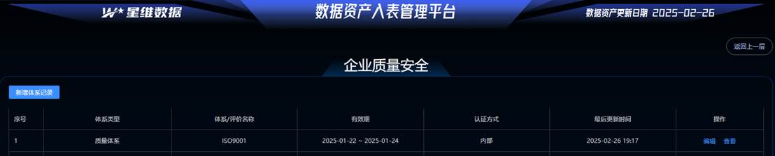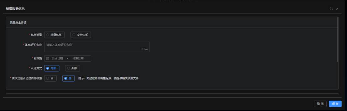 企业质量安全体系中展示了企业获取的“质量体系”认证和“安全体系”认证的情况。包括认证名称、认证方式、认证有效期。