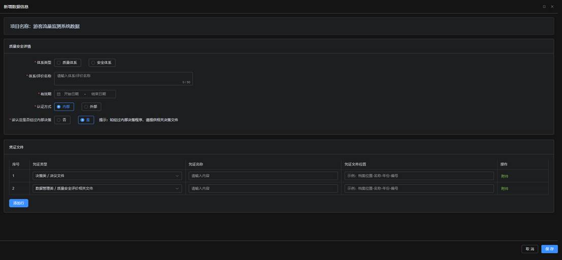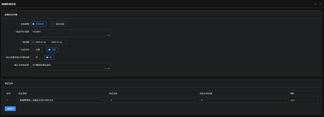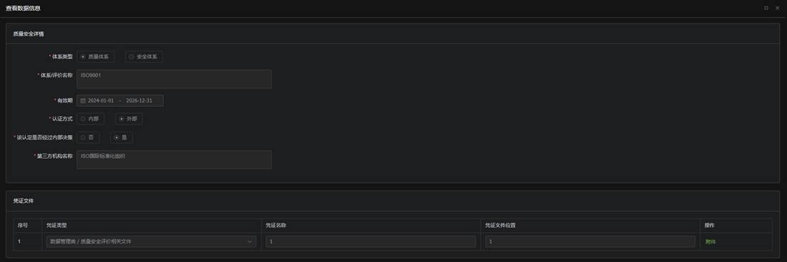 项目质量/安全体系详情中展示了体系类型、体系名称、有效期、认证方式、最后更新时间、操作栏。点击“查阅凭证”将展示凭证明细,如存在附件可查看电子凭证。
