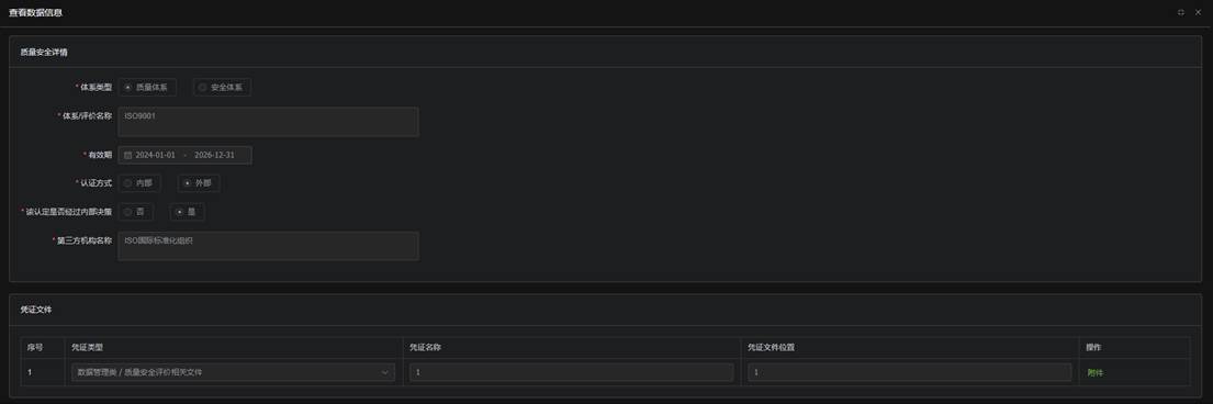 企业质量/安全体系认证详情中展示了体系类型、体系名称、有效期、认证方式、最后更新时间、操作栏。点击“查阅凭证”将展示凭证明细,如存在附件可查看电子凭证。