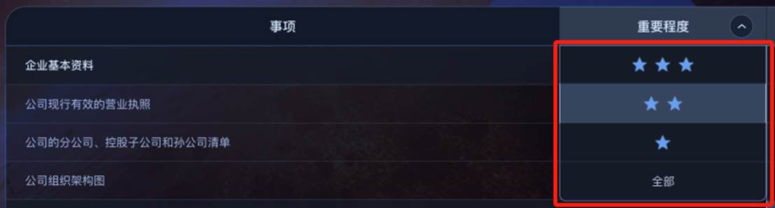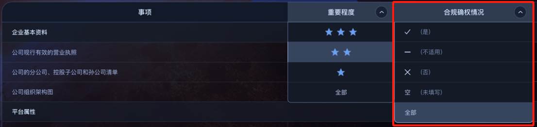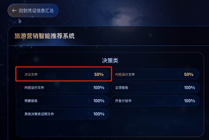 例如:点击二级分类(决议文件)将展示该二级分类(决议文件)的凭证完整度构成详情。如上图所示,表格反应了10个操作流程需要决议文件,其中序号1-5凭证完整,序号6-10凭证缺失,因此得到完整度为50%。
