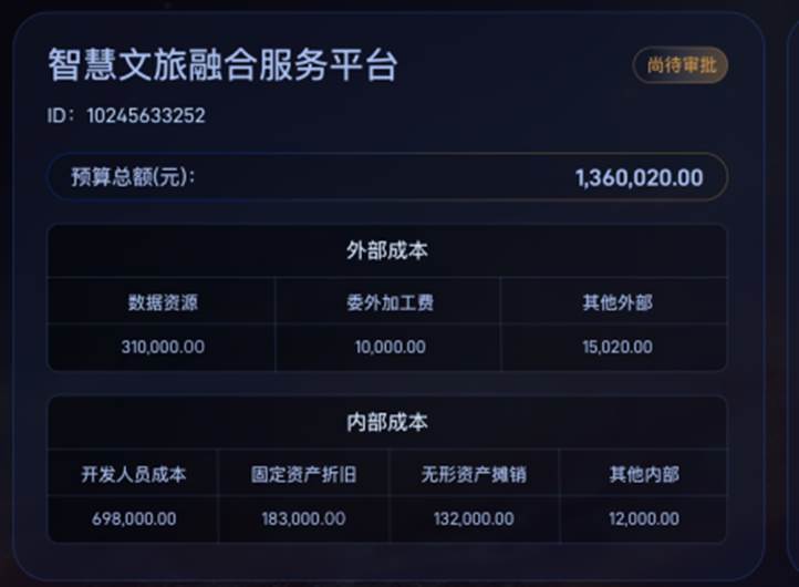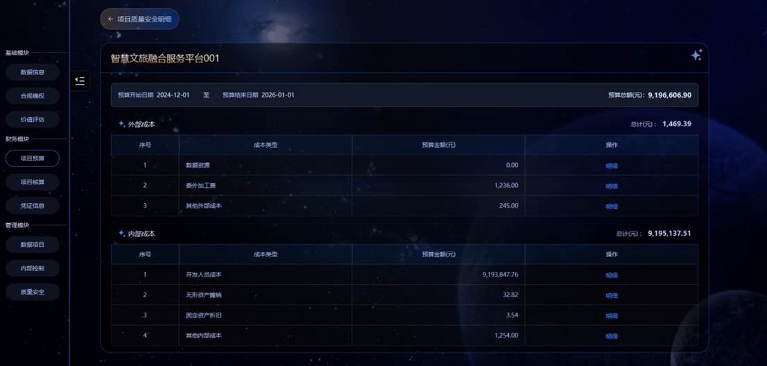用户点击任意其他模块按钮,可以切换至本项目下,对应的其他模块。如目前用户在“智慧文旅融合平台001”项目下的项目质量安全模块详情页中,点击“项目预算”按钮后,将切换至“智慧文旅融合平台001”项目下的项目预算详情页。
