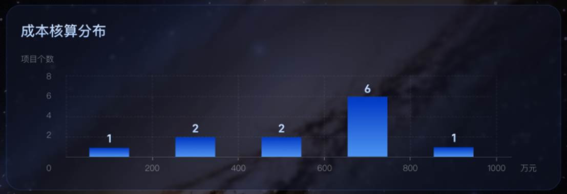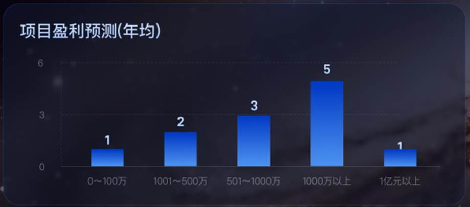 “项目盈利预测(年均)”柱状图中展示了各个项目盈利预测的分布。如上图举例所示:年均盈利0-100万元的项目数量为1个;年均盈利101-200万元的项目数量为2个;201-300万元的项目数量为3个;301-400万项目数量为5个;400万以上项目数量为1个。