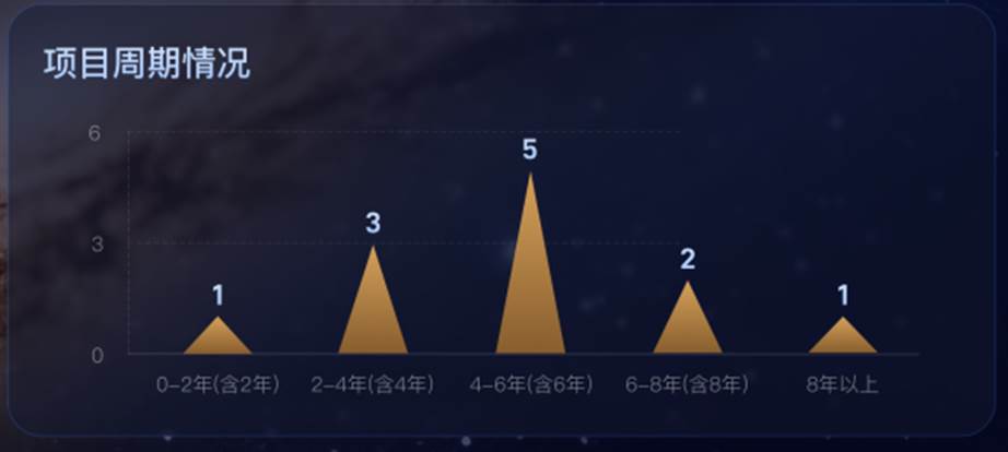 “项目周期情况”图表展示了各个项目的周期情况。如上图所示,项目周期为0-2年(含2年)的项目数为1个;项目周期为2-4年(含4年)的项目数为3个;项目周期为4-6年(含6年)的项目数为5个;项目周期为6-8年(含8年)的项目数为2个;项目周期为8年以上的项目数为1个。