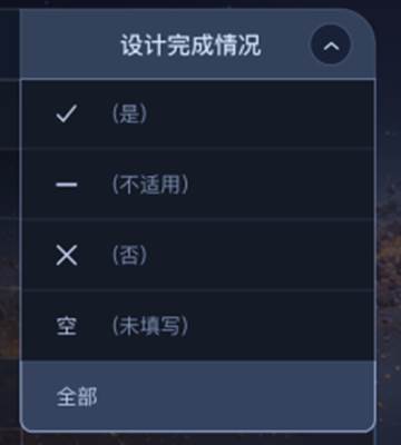 如需筛选,可以通过点击“设计完成情况”表头弹出下拉选择框。用户可以通过点击选项对列表进行筛选。(如点击“√(是)”可以筛选出完成情况为“是”的所有事项。)
