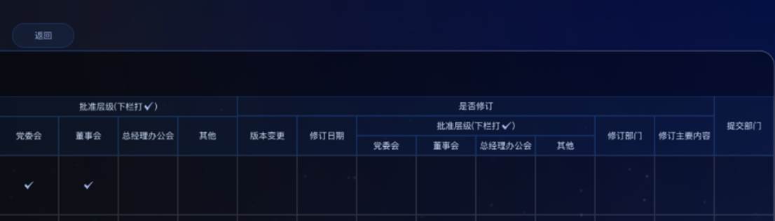 以上明细全面展示了内控设计的材料提交情况、文件名称、文件编号、章/节/条(具体描述的位置)、制定日期、批准层级(党委会、董事会、总经理办公会、其他)、版本变更、修订日期、修订批准层级、修订部门、修订主要内容、提交部门。